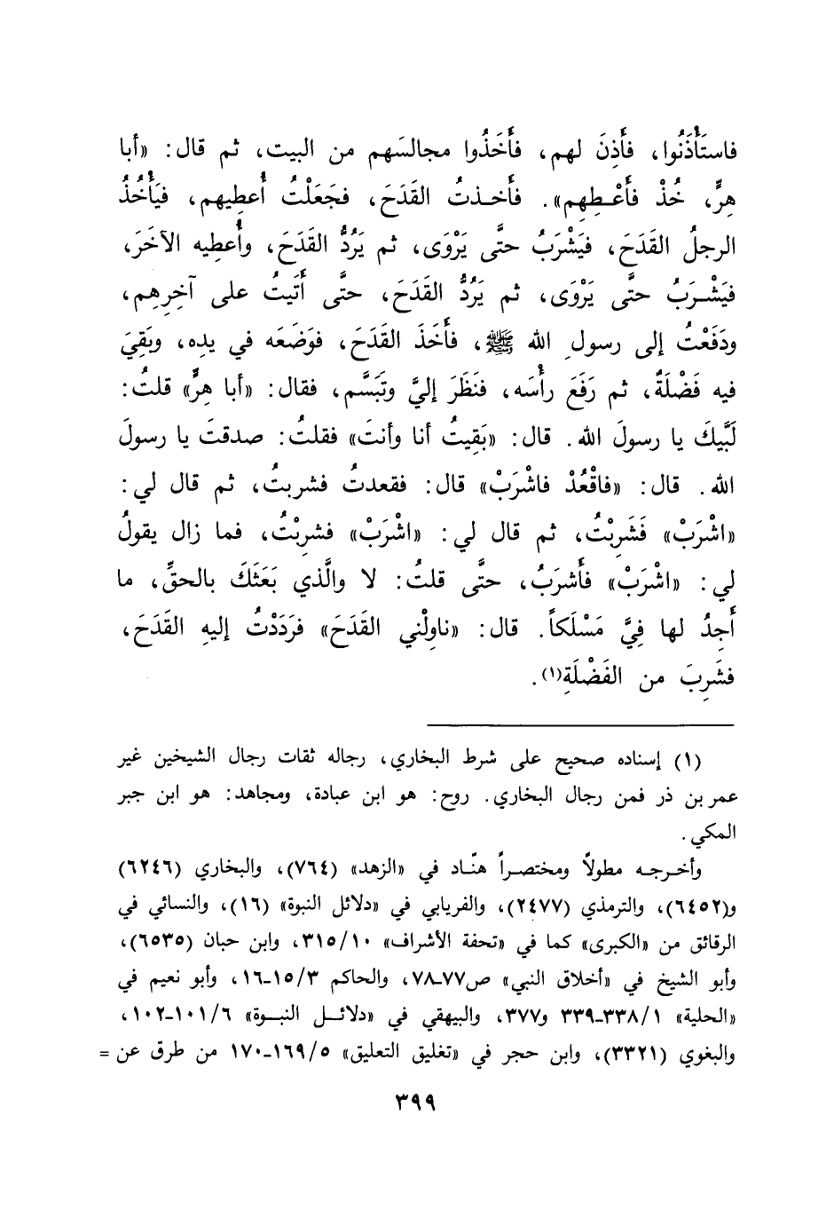 فَاسْتَأْذَنُوا، فَأَذِنَ لَهُمْ، فَأَخَذُوا مَجَالِسَهُمْ مِنَ الْبَيْتِ، ثُمَّ قَالَ: " أَبَا هِرٍّ خُذْ فَأَعْطِهِمْ ". فَأَخَذْتُ الْقَدَحَ، فَجَعَلْتُ أُعْطِيهِمْ، فَيَأْخُذُ الرَّجُلُ الْقَدَحَ، فَيَشْرَبُ حَتَّى يَرْوَى، ثُمَّ يَرُدُّ الْقَدَحَ، وَأُعْطِيهِ الْآخَرَ، فَيَشْرَبُ حَتَّى يَرْوَى، ثُمَّ يَرُدُّ الْقَدَحَ، حَتَّى أَتَيْتُ عَلَى آخِرِهِمْ، وَدَفَعْتُ إِلَى رَسُولِ اللهِ صَلَّى اللهُ عَلَيْهِ وَسَلَّمَ، فَأَخَذَ الْقَدَحَ، فَوَضَعَهُ فِي يَدِهِ، وَبَقِيَ فِيهِ فَضْلَةٌ، ثُمَّ رَفَعَ رَأْسَهُ، فَنَظَرَ إِلَيَّ وَتَبَسَّمَ، فَقَالَ: " أَبَا هِرٍّ " قُلْتُ: لَبَّيْكَ يَا رَسُولَ اللهِ. قَالَ: " بَقِيتُ أَنَا وَأَنْتَ " فَقُلْتُ: صَدَقْتَ يَا رَسُولَ اللهِ. قَالَ: " فَاقْعُدْ فَاشْرَبْ " قَالَ: فَقَعَدْتُ فَشَرِبْتُ، ثُمَّ قَالَ لِيَ: " اشْرَبْ " فَشَرِبْتُ، ثُمَّ قَالَ لِيَ: " اشْرَبْ " فَشَرِبْتُ، فَمَا زَالَ يَقُولُ لِيَ: " اشْرَبْ " فَأَشْرَبُ، حَتَّى قُلْتُ: لَا وَالَّذِي بَعَثَكَ بِالْحَقِّ، مَا أَجِدُ لَهَا فِيَّ مَسْلَكًا. قَالَ: " نَاوِلْنِي الْقَدَحَ " فَرَدَدْتُ إِلَيْهِ الْقَدَحَ، فَشَرِبَ مِنَ الْفَضْلَةِ (١)