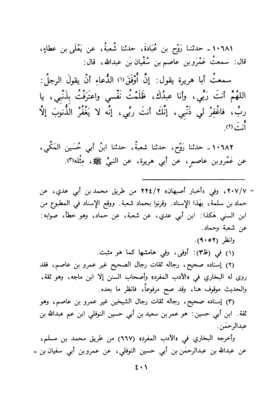 ١٠٦٨٢ - حَدَّثَنَا رَوْحٌ، حَدَّثَنَا شُعْبَةُ، حَدَّثَنَا ابْنُ أَبِي حُسَيْنٍ الْمَكِّيُّ، عَنْ عَمْرِو بْنِ عَاصِمٍ، عَنْ أَبِي هُرَيْرَةَ عَنِ النَّبِيِّ صَلَّى اللهُ عَلَيْهِ وَسَلَّمَ مِثْلَهُ (٣)
