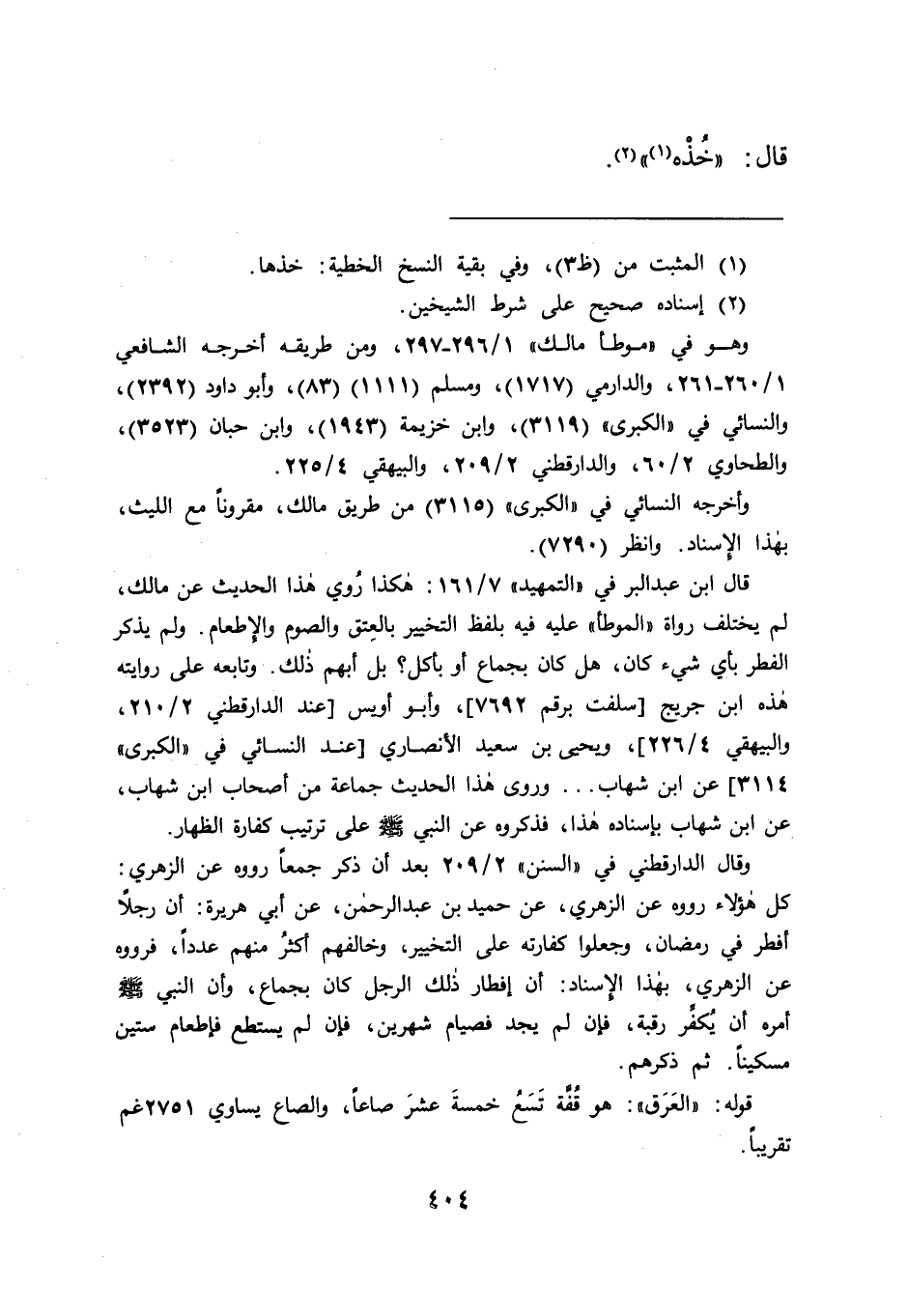 وقال الدارقطني في "السنن" ٢/٢٠٩ بعد أن ذكر جمعاً رووه عن الزهري: كل هؤلاء رووه عن الزهري، عن حميد بن عبد الرحمن، عن أبي هريرة: أن رجلًا أفطر في رمضان، وجعلوا كفارته على التخيير، وخالفهم أكثرُ منهم عدداً، فرووه عن الزهري، بهذا الإسناد: أن إفطار ذلك الرجل كان بجماع، وأن النبي صَلَّى اللهُ عَلَيْهِ وَسَلَّمَ أمره أن يُكفر رقبة، فإن لم يجد فصيام شهرين، فإن لم يستطع فإطعام ستين مسكيناً. ثم ذكرهم.