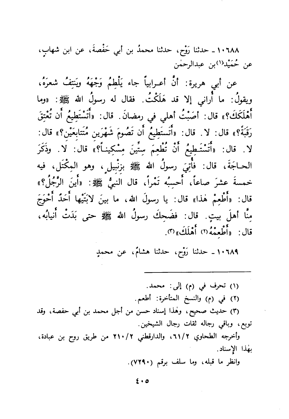 ١٠٦٨٨ - حَدَّثَنَا رَوْحٌ، حَدَّثَنَا مُحَمَّدُ بْنُ أَبِي حَفْصَةَ، عَنِ ابْنِ شِهَابٍ، عَنْ حُمَيْدِ (١) بْنِ عَبْدِ الرَّحْمَنِ، عَنْ أَبِي هُرَيْرَةَ، أَنَّ أَعْرَابِيًّا، جَاءَ يَلْطِمُ وَجْهَهُ وَيَنْتِفُ شَعَرَهُ، وَيَقُولُ: مَا أُرَانِي إِلَّا قَدْ هَلَكْتُ. فَقَالَ لَهُ رَسُولُ اللهِ صَلَّى اللهُ عَلَيْهِ وَسَلَّمَ: " وَمَا أَهْلَكَكَ؟ " قَالَ: أَصَبْتُ أَهْلِي فِي رَمَضَانَ. قَالَ: " أَتَسْتَطِيعُ أَنْ تُعْتِقَ رَقَبَةً؟ " قَالَ: لَا. قَالَ: " أَتَسْتَطِيعُ أَنْ تَصُومَ شَهْرَيْنِ مُتَتَابِعَيْنِ؟ " قَالَ: لَا. قَالَ: " أَتَسْتَطِيعُ أَنْ تُطْعِمَ سِتِّينَ مِسْكِينًا؟ " قَالَ: لَا. وَذَكَرَ الْحَاجَةَ، قَالَ: فَأُتِيَ رَسُولُ اللهِ صَلَّى اللهُ عَلَيْهِ وَسَلَّمَ بِزِنْبِيلٍ، وَهُوَ الْمِكْتَلُ، فِيهِ خَمْسَةَ عَشَرَ صَاعًا أَحْسَبُهُ تَمْرًا، قَالَ النَّبِيُّ صَلَّى اللهُ عَلَيْهِ وَسَلَّمَ: " أَيْنَ الرَّجُلُ؟ " قَالَ: " أَطْعِمْ هَذَا " قَالَ: يَا رَسُولَ اللهِ، مَا بَيْنَ لَابَتَيْهَا أَحَدٌ أَحْوَجُ مِنَّا أَهْلُ بَيْتٍ. قَالَ: فَضَحِكَ رَسُولُ اللهِ صَلَّى اللهُ عَلَيْهِ وَسَلَّمَ حَتَّى بَدَتْ أَنْيَابُهُ، قَالَ: " أَطْعِمْهُ (٢) أَهْلَكَ " (٣)