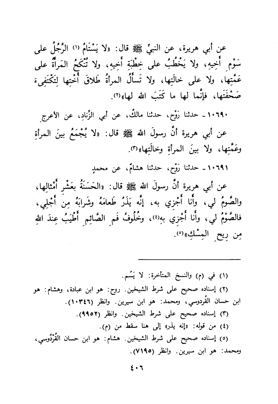 ١٠٦٩٠ - حَدَّثَنَا رَوْحٌ، حَدَّثَنَا مَالِكٌ، عَنْ أَبِي الزِّنَادِ، عَنِ الْأَعْرَجِ، عَنْ أَبِي هُرَيْرَةَ، أَنَّ رَسُولَ اللهِ صَلَّى اللهُ عَلَيْهِ وَسَلَّمَ قَالَ: " لَا يُجْمَعُ بَيْنَ الْمَرْأَةِ وَعَمَّتِهَا، وَلَا بَيْنَ الْمَرْأَةِ وَخَالَتِهَا " (٣)