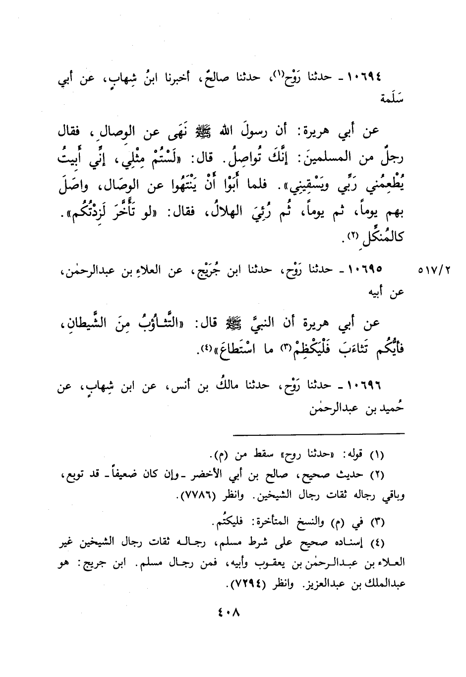 ١٠٦٩٤ - حَدَّثَنَا رَوْحٌ (١) ، حَدَّثَنَا صَالِحٌ، أَخْبَرَنَا ابْنُ شِهَابٍ، عَنْ أَبِي سَلَمَةَ، عَنْ أَبِي هُرَيْرَةَ، أَنَّ رَسُولَ اللهِ صَلَّى اللهُ عَلَيْهِ وَسَلَّمَ نَهَى عَنِ الْوِصَالِ، فَقَالَ رَجُلٌ مِنَ الْمُسْلِمِينَ: إِنَّكَ تُوَاصِلُ. قَالَ: " لَسْتُمْ مِثْلِي إِنِّي أَبِيتُ يُطْعِمُنِي رَبِّي وَيَسْقِينِي ". فَلَمَّا أَبَوْا أَنْ يَنْتَهُوا عَنِ الْوِصَالِ، وَاصَلَ بِهِمْ يَوْمًا، ثُمَّ يَوْمًا، ثُمَّ رُئِيَ الْهِلَالُ، فَقَالَ: " لَوْ تَأَخَّرَ لَزِدْتُكُمْ كَالْمُنَكِّلِ " (٢)