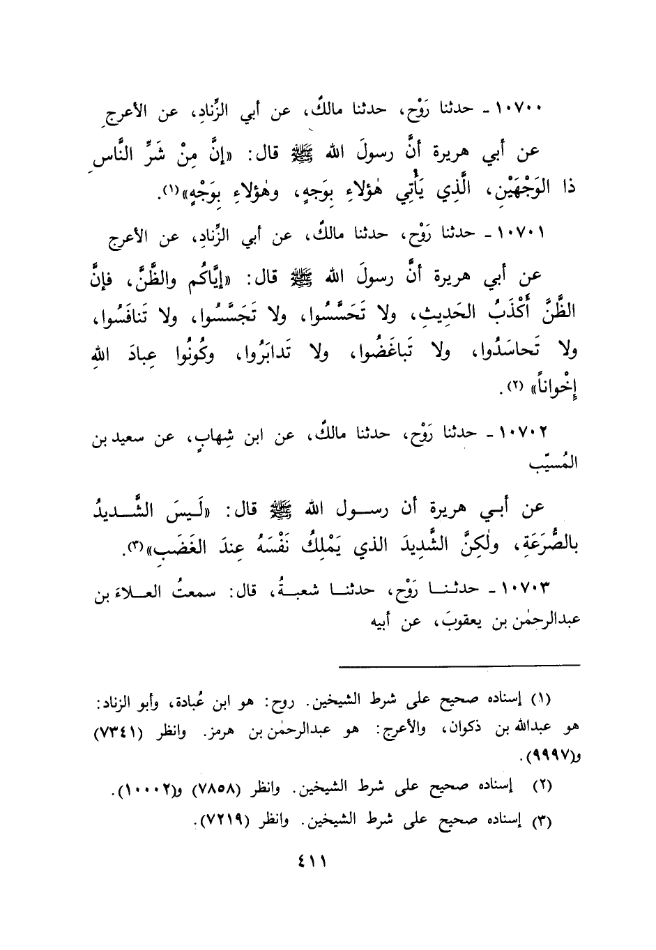 ١٠٧٠٠ - حَدَّثَنَا رَوْحٌ، حَدَّثَنَا مَالِكٌ، عَنْ أَبِي الزِّنَادِ، عَنِ الْأَعْرَجِ، عَنْ أَبِي هُرَيْرَةَ، أَنَّ رَسُولَ اللهِ صَلَّى اللهُ عَلَيْهِ وَسَلَّمَ قَالَ: " إِنَّ مِنْ شَرِّ النَّاسِ ذَا الْوَجْهَيْنِ، الَّذِي يَأْتِي هَؤُلَاءِ بِوَجْهٍ، وَهَؤُلَاءِ بِوَجْهٍ " (١)