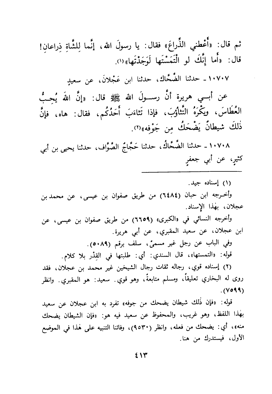 ١٠٧٠٧ - حَدَّثَنَا الضَّحَّاكُ، حَدَّثَنَا ابْنُ عَجْلَانَ، عَنْ سَعِيدٍ، عَنْ أَبِي هُرَيْرَةَ، أَنَّ رَسُولَ اللهِ صَلَّى اللهُ عَلَيْهِ وَسَلَّمَ قَالَ: " إِنَّ اللهَ يُحِبُّ الْعُطَاسَ، وَيَكْرَهُ التَّثَاؤُبَ، فَإِذَا تَثَاءَبَ أَحَدُكُمْ، فَقَالَ: هَاهْ، فَإِنَّ ذَلِكَ شَيْطَانٌ يَضْحَكُ مِنْ جَوْفِهِ " (٢)