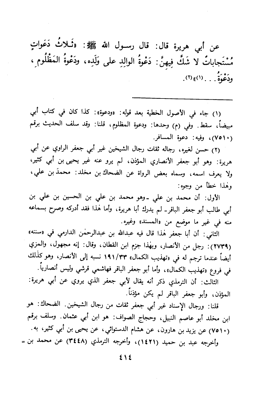 عَنْ أَبِي هُرَيْرَةَ، قَالَ: قَالَ رَسُولُ اللهِ صَلَّى اللهُ عَلَيْهِ وَسَلَّمَ: " ثَلَاثُ دَعَوَاتٍ مُسْتَجَابَاتٌ لَا شَكَّ فِيهِنَّ: دَعْوَةُ الْوَالِدِ عَلَى وَلَدِهِ، وَدَعْوَةُ الْمَظْلُومِ، وَدَعْوَةُ ... (١) " (٢)