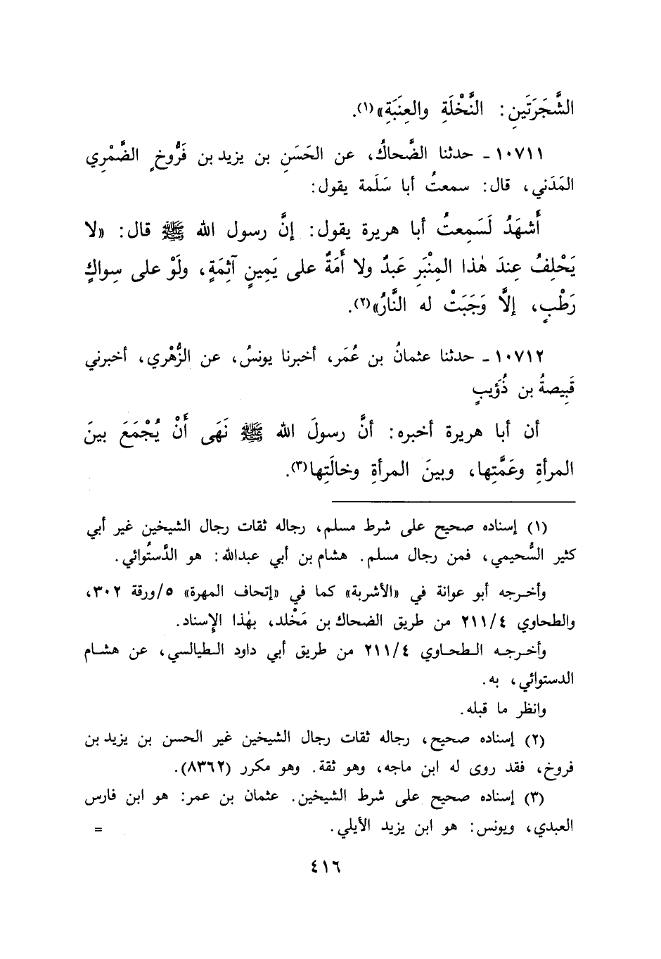 ١٠٧١٢ - حَدَّثَنَا عُثْمَانُ بْنُ عُمَرَ، أَخْبَرَنَا يُونُسُ، عَنِ الزُّهْرِيِّ، أَخْبَرَنِي قَبِيصَةُ بْنُ ذُؤَيْبٍ، أَنَّ أَبَا هُرَيْرَةَ، أَخْبَرَهُ أَنَّ رَسُولَ اللهِ صَلَّى اللهُ عَلَيْهِ وَسَلَّمَ " نَهَى أَنْ يُجْمَعَ بَيْنَ الْمَرْأَةِ وَعَمَّتِهَا، وَبَيْنَ الْمَرْأَةِ وَخَالَتِهَا " (٣)