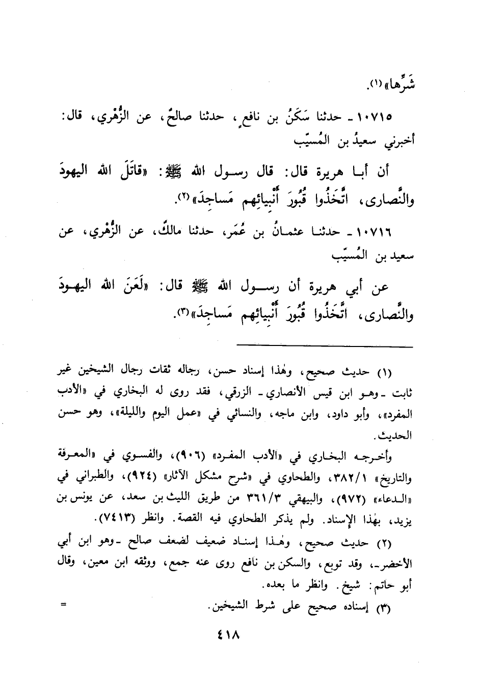 ١٠٧١٥ - حَدَّثَنَا سَكَنُ بْنُ نَافِعٍ، حَدَّثَنَا صَالِحٌ، عَنِ الزُّهْرِيِّ، قَالَ: أَخْبَرَنِي سَعِيدُ بْنُ الْمُسَيِّبِ، أَنَّ أَبَا هُرَيْرَةَ، قَالَ: قَالَ رَسُولُ اللهِ صَلَّى اللهُ عَلَيْهِ وَسَلَّمَ: " قَاتَلَ اللهُ الْيَهُودَ وَالنَّصَارَى، اتَّخَذُوا قُبُورَ أَنْبِيَائِهِمْ مَسَاجِدَ " (٢)