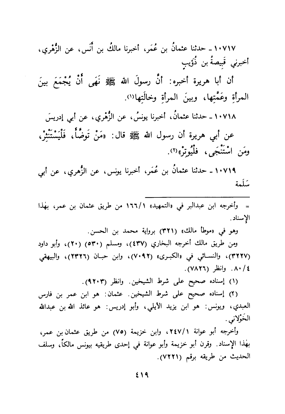١٠٧١٧ - حَدَّثَنَا عُثْمَانُ بْنُ عُمَرَ، أَخْبَرَنَا مَالِكُ بْنُ أَنَسٍ، عَنِ الزُّهْرِيِّ، أَخْبَرَنِي قَبِيصَةُ بْنُ ذُؤَيْبٍ، أَنَّ أَبَا هُرَيْرَةَ، أَخْبَرَهُ: أَنَّ رَسُولَ اللهِ صَلَّى اللهُ عَلَيْهِ وَسَلَّمَ " نَهَى أَنْ يُجْمَعَ بَيْنَ الْمَرْأَةِ وَعَمَّتِهَا، وَبَيْنَ الْمَرْأَةِ وَخَالَتِهَا " (١)