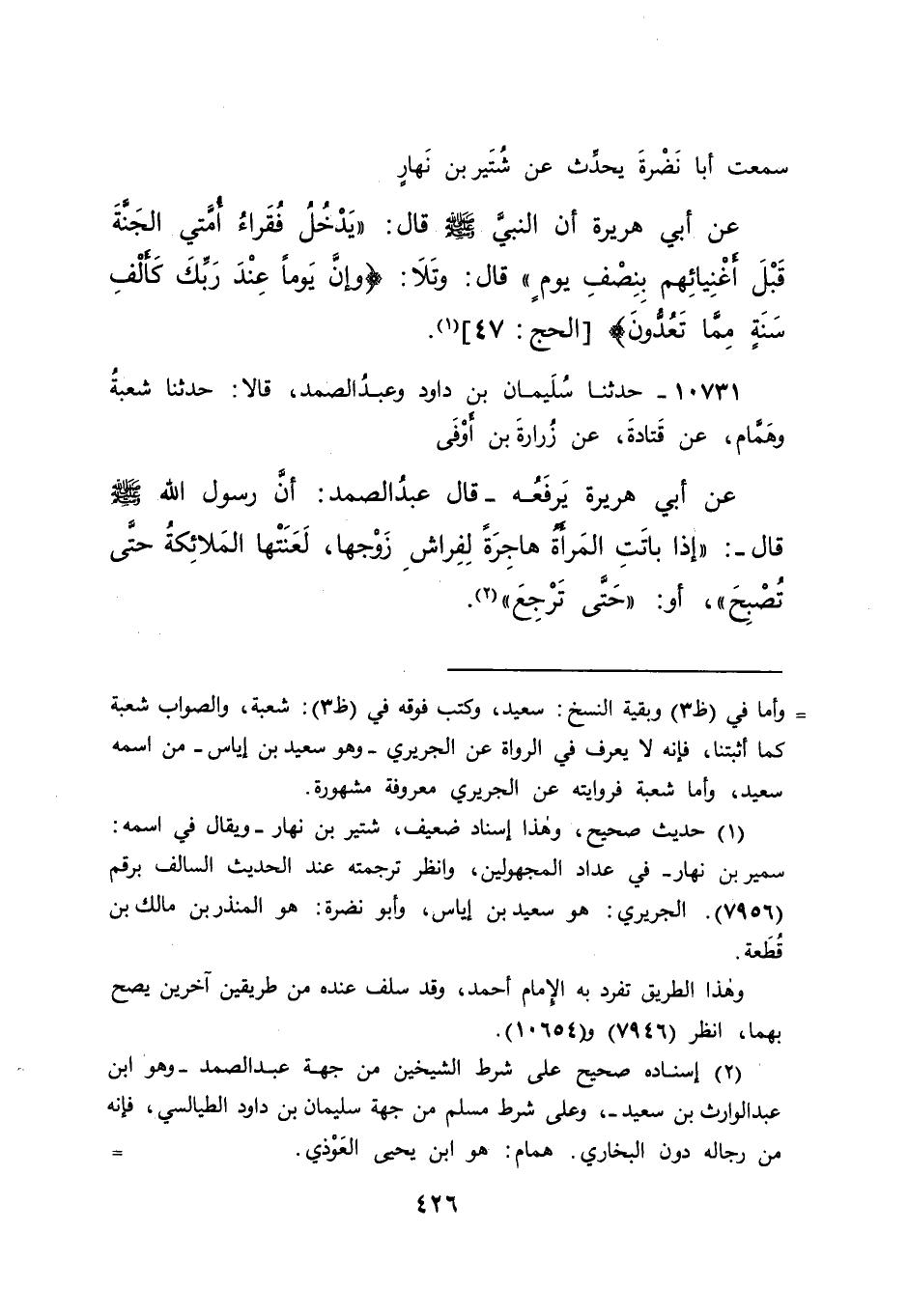 ١٠٧٣١ - حَدَّثَنَا سُلَيْمَانُ بْنُ دَاوُدَ، وَعَبْدُ الصَّمَدِ، قَالَا: حَدَّثَنَا شُعْبَةُ، وَهَمَّامٌ، عَنْ قَتَادَةَ، عَنْ زُرَارَةَ بْنِ أَوْفَى، عَنْ أَبِي هُرَيْرَةَ، يَرْفَعُهُ قَالَ عَبْدُ الصَّمَدِ: إِنَّ رَسُولَ اللهِ صَلَّى اللهُ عَلَيْهِ وَسَلَّمَ قَالَ: " إِذَا بَاتَتِ الْمَرْأَةُ هَاجِرَةً لِفِرَاشِ زَوْجِهَا، لَعَنَتْهَا الْمَلَائِكَةُ حَتَّى تُصْبِحَ " أَوْ " حَتَّى تَرْجِعَ " (٢)