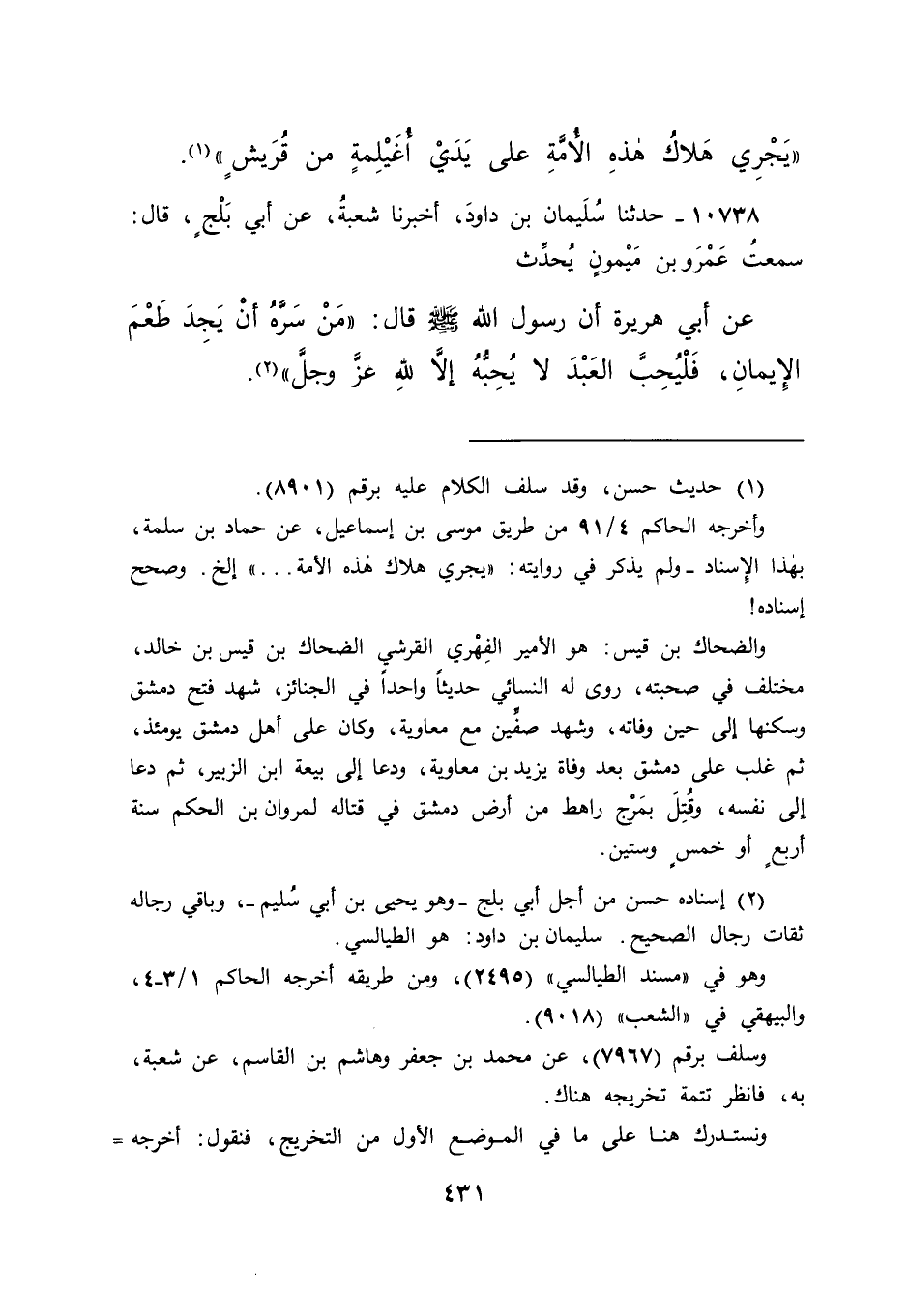 ١٠٧٣٨ - حَدَّثَنَا سُلَيْمَانُ بْنُ دَاوُدَ، أَخْبَرَنَا شُعْبَةُ، عَنْ أَبِي بَلْجٍ، قَالَ: سَمِعْتُ عَمْرَو بْنَ مَيْمُونٍ، يُحَدِّثُ عَنْ أَبِي هُرَيْرَةَ، أَنَّ رَسُولَ اللهِ صَلَّى اللهُ عَلَيْهِ وَسَلَّمَ قَالَ: " مَنْ سَرَّهُ أَنْ يَجِدَ طَعْمَ الْإِيمَانِ، فَلْيُحِبَّ الْعَبْدَ لَا يُحِبُّهُ إِلَّا لِلَّهِ عَزَّ وَجَلَّ " (٢)
