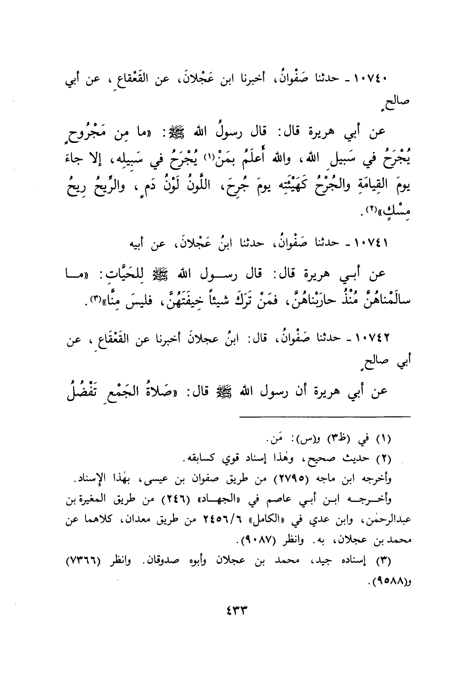 ١٠٧٤٠ - حَدَّثَنَا صَفْوَانُ، أَخْبَرَنَا ابْنُ عَجْلَانَ، عَنِ الْقَعْقَاعِ، عَنْ أَبِي صَالِحٍ، عَنْ أَبِي هُرَيْرَةَ، قَالَ: قَالَ رَسُولُ اللهِ صَلَّى اللهُ عَلَيْهِ وَسَلَّمَ: " مَا مِنْ مَجْرُوحٍ يُجْرَحُ فِي سَبِيلِ اللهِ، وَاللهُ أَعْلَمُ بِمَنْ (١) يُجْرَحُ فِي سَبِيلِهِ، إِلَّا جَاءَ يَوْمَ الْقِيَامَةِ وَالْجُرْحُ كَهَيْئَتِهِ يَوْمَ جُرِحَ، اللَّوْنُ لَوْنُ دَمٍ، وَالرِّيحُ رِيحُ مِسْكٍ " (٢)