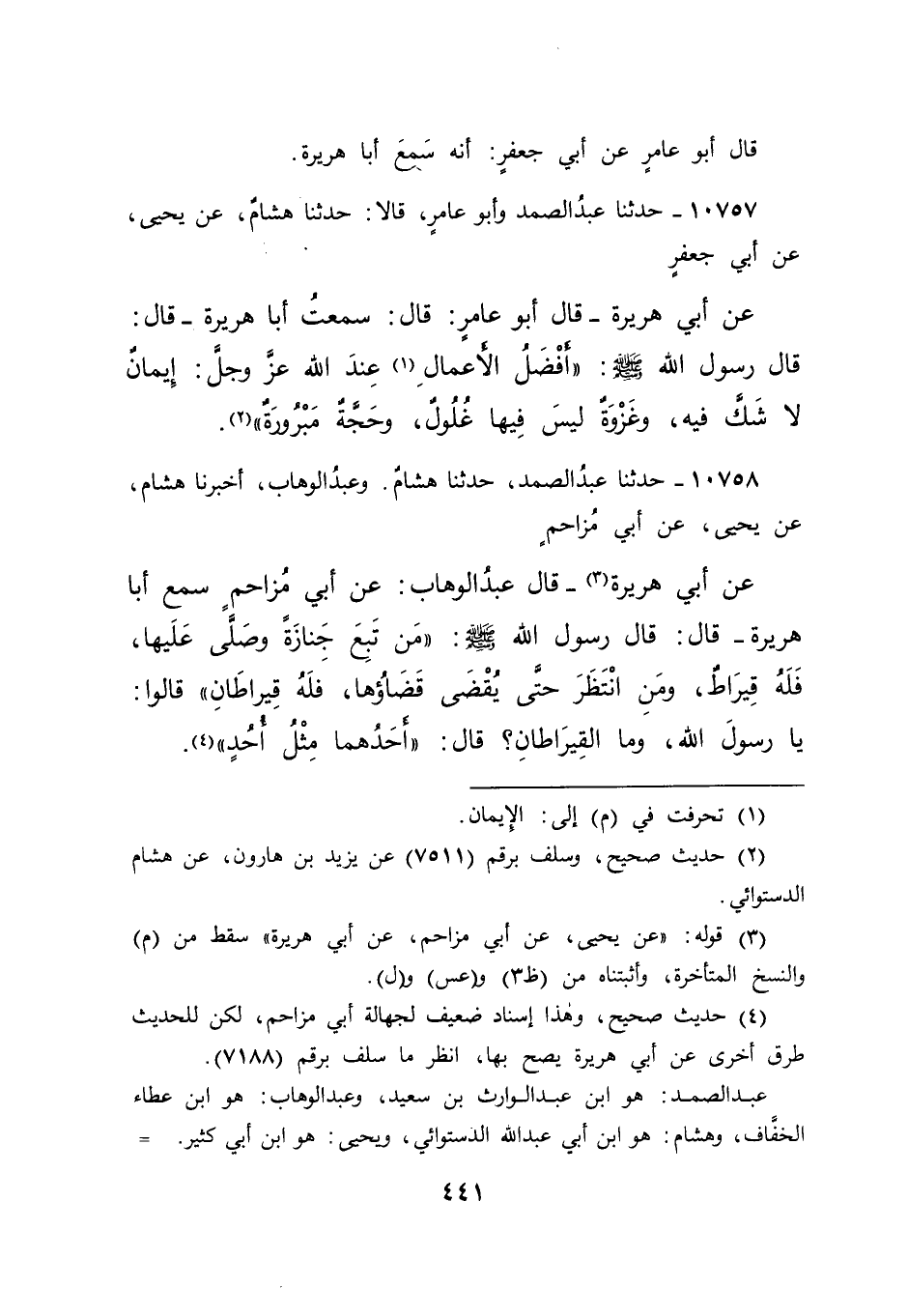 ١٠٧٥٧ - حَدَّثَنَا عَبْدُ الصَّمَدِ، وَأَبُو عَامِرٍ، قَالَا: حَدَّثَنَا هِشَامٌ، عَنْ يَحْيَى، عَنْ أَبِي جَعْفَرٍ، عَنْ أَبِي هُرَيْرَةَ، قَالَ: أَبُو عَامِرٍ قَالَ: سَمِعْتُ أَبَا هُرَيْرَةَ، قَالَ: قَالَ رَسُولُ اللهِ صَلَّى اللهُ عَلَيْهِ وَسَلَّمَ: " أَفْضَلُ الْأَعْمَالِ (١) عِنْدَ اللهِ عَزَّ وَجَلَّ: إِيمَانٌ لَا شَكَّ فِيهِ، وَغَزْوَةٌ لَيْسَ فِيهَا غُلُولٌ، وَحَجَّةٌ مَبْرُورَةٌ " (٢)