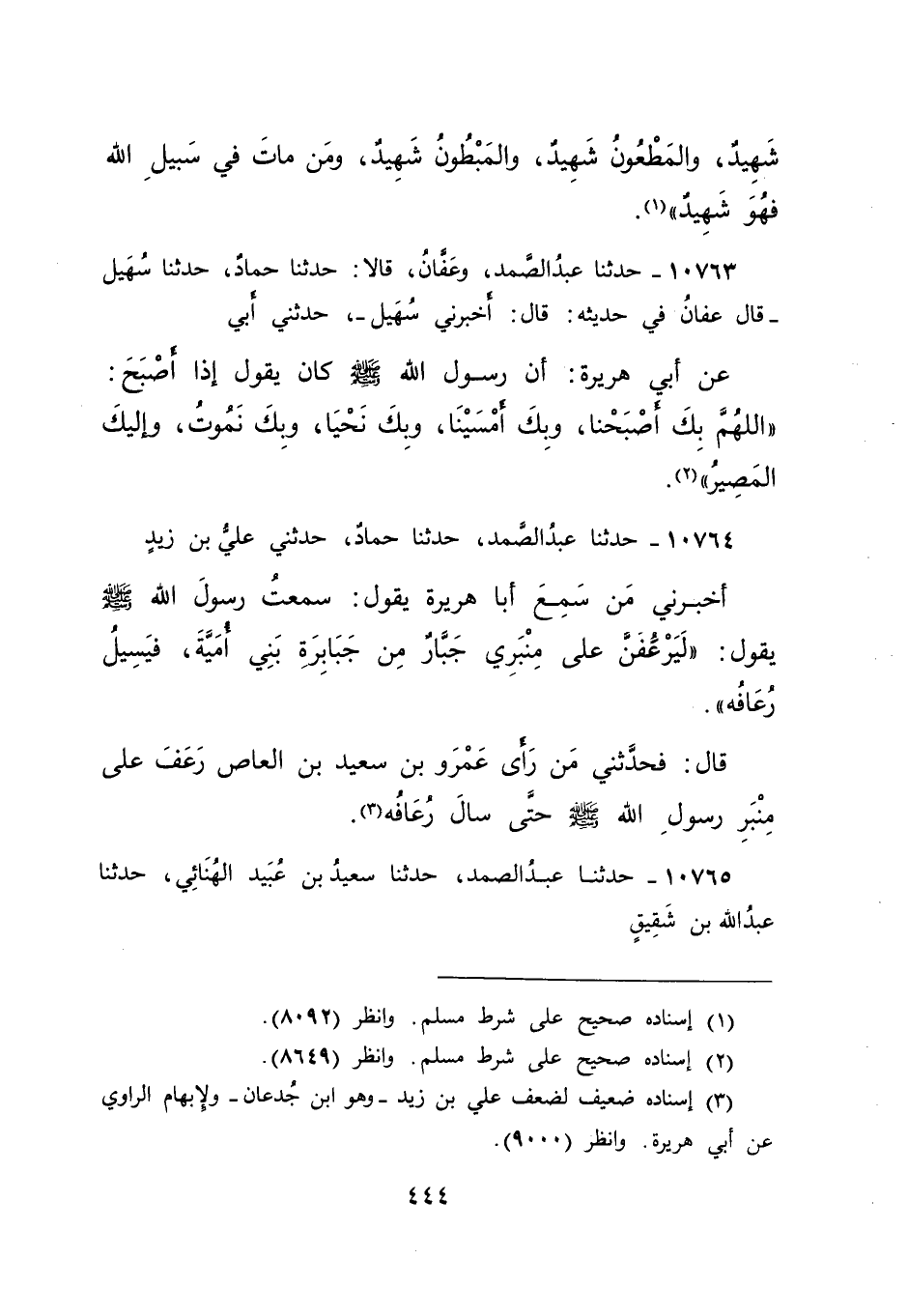 ١٠٧٦٣ - حَدَّثَنَا عَبْدُ الصَّمَدِ، وَعَفَّانُ، قَالَا: حَدَّثَنَا حَمَّادٌ، حَدَّثَنَا سُهَيْلٌ، قَالَ: عَفَّانُ فِي حَدِيثِهِ قَالَ: أَخْبَرَنِي سُهَيْلٌ، حَدَّثَنِي أَبِي، عَنْ أَبِي هُرَيْرَةَ، أَنَّ رَسُولَ اللهِ صَلَّى اللهُ عَلَيْهِ وَسَلَّمَ كَانَ يَقُولُ إِذَا أَصْبَحَ: " اللهُمَّ بِكَ أَصْبَحْنَا، وَبِكَ أَمْسَيْنَا، وَبِكَ نَحْيَا، وَبِكَ نَمُوتُ، وَإِلَيْكَ الْمَصِيرُ " (٢)