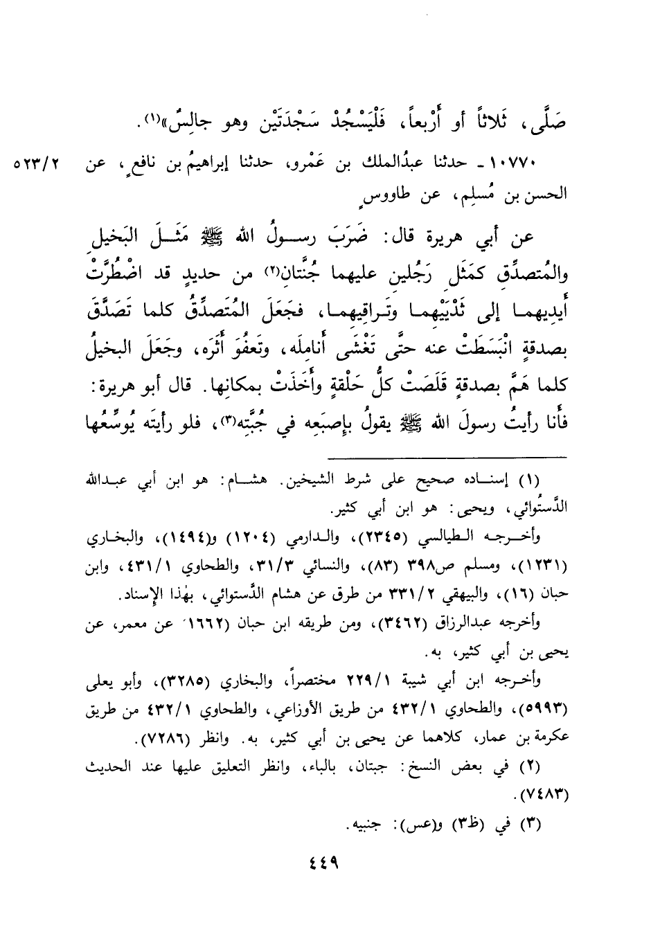 ١٠٧٧٠ - حَدَّثَنَا عَبْدُ الْمَلِكِ بْنُ عَمْرٍو، حَدَّثَنَا إِبْرَاهِيمُ بْنُ نَافِعٍ، عَنِ الْحَسَنِ بْنِ مُسْلِمٍ، عَنْ طَاوُسٍ، عَنْ أَبِي هُرَيْرَةَ، قَالَ: ضَرَبَ رَسُولُ اللهِ صَلَّى اللهُ عَلَيْهِ وَسَلَّمَ " مَثَلَ الْبَخِيلِ وَالْمُتَصَدِّقِ كَمَثَلِ رَجُلَيْنِ عَلَيْهِمَا جُنَّتَانِ (٢) مِنْ حَدِيدٍ قَدِ اضْطُرَّتْ أَيْدِيهِمَا إِلَى ثَدْيَيْهِمَا وَتَرَاقِيهِمَا، فَجَعَلَ الْمُتَصَدِّقُ كُلَّمَا تَصَدَّقَ بِصَدَقَةٍ انْبَسَطَتْ عَنْهُ حَتَّى تَغْشَى أَنَامِلَهُ، وَتَعْفُوَ أَثَرَهُ، وَجَعَلَ الْبَخِيلُ كُلَّمَا هَمَّ بِصَدَقَةٍ قَلَصَتْ كُلُّ حَلْقَةٍ وَأَخَذَتْ بِمَكَانِهَا ". قَالَ أَبُو هُرَيْرَةَ: فَأَنَا رَأَيْتُ رَسُولَ اللهِ صَلَّى اللهُ عَلَيْهِ وَسَلَّمَ يَقُولُ بِإِصْبَعَيْهِ فِي جُبَّتِهِ (٣) ، فَلَوْ رَأَيْتَهُ يُوَسِّعُهَا