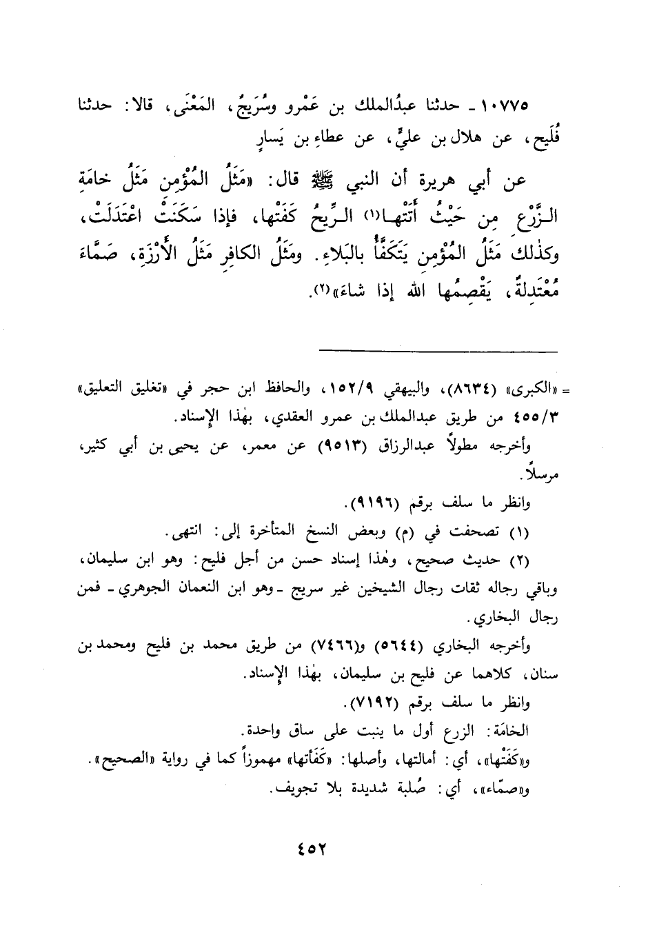 ١٠٧٧٥ - حَدَّثَنَا عَبْدُ الْمَلِكِ بْنُ عَمْرٍو، وَسُرَيْجٌ الْمَعْنَى، قَالَا: حَدَّثَنَا فُلَيْحٌ، عَنْ هِلَالِ بْنِ عَلِيٍّ، عَنْ عَطَاءِ بْنِ يَسَارٍ، عَنْ أَبِي هُرَيْرَةَ، أَنَّ النَّبِيَّ صَلَّى اللهُ عَلَيْهِ وَسَلَّمَ قَالَ: " مَثَلُ الْمُؤْمِنِ مَثَلُ خَامَةِ الزَّرْعِ مِنْ حَيْثُ أَتَتْهَا (١) الرِّيحُ كَفَتْهَا، فَإِذَا سَكَنَتْ اعْتَدَلَتْ، وَكَذَلِكَ مَثَلُ الْمُؤْمِنِ يَتَكَفَّأُ بِالْبَلَاءِ. وَمَثَلُ الْكَافِرِ مَثَلُ الْأَرْزَةِ، صَمَّاءُ مُعْتَدِلَةٌ، يَقْصِمُهَا اللهُ إِذَا شَاءَ " (٢)