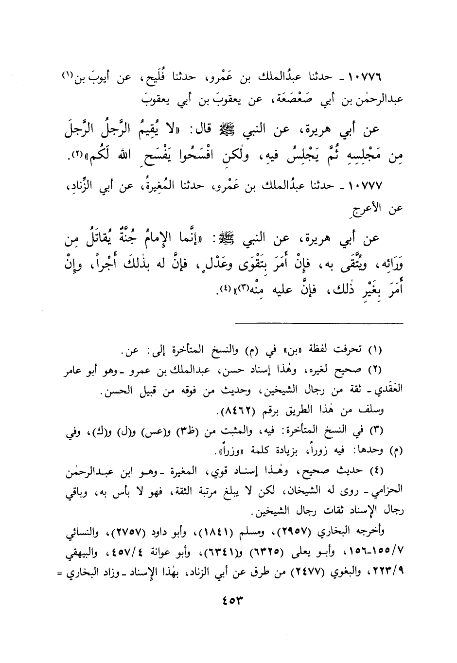 ١٠٧٧٧ - حَدَّثَنَا عَبْدُ الْمَلِكِ بْنُ عَمْرٍو، حَدَّثَنَا الْمُغِيرَةُ، عَنْ أَبِي الزِّنَادِ، عَنِ الْأَعْرَجِ، عَنْ أَبِي هُرَيْرَةَ، عَنِ النَّبِيِّ صَلَّى اللهُ عَلَيْهِ وَسَلَّمَ: " إِنَّمَا الْإِمَامُ جُنَّةٌ يُقَاتَلُ مِنْ وَرَائِهِ، وَيُتَّقَى بِهِ، فَإِنْ أَمَرَ بِتَقْوَى وَعَدَلَ، فَإِنَّ لَهُ بِذَلِكَ أَجْرًا، وَإِنْ أَمَرَ بِغَيْرِ ذَلِكَ، فَإِنَّ عَلَيْهِ مِنْهُ (٣) " (٤)