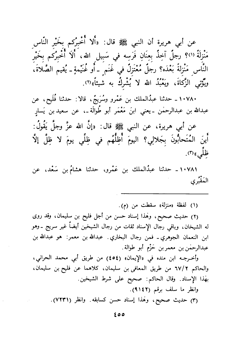 عَنْ أَبِي هُرَيْرَةَ، أَنَّ النَّبِيَّ صَلَّى اللهُ عَلَيْهِ وَسَلَّمَ قَالَ: " أَلَا أُخْبِرُكُمْ بِخَيْرِ النَّاسِ مَنْزِلَةً (١) رَجُلٌ آخِذٌ بِعِنَانِ فَرَسِهِ فِي سَبِيلِ اللهِ، أَلَا أُخْبِرُكُمْ بِخَيْرِ النَّاسِ مَنْزِلَةً بَعْدَهُ؟ رَجُلٌ مُعْتَزِلٌ فِي غَنَمٍ - أَوْ غُنَيْمَةٍ - يُقِيمُ الصَّلَاةَ، وَيُؤْتِي الزَّكَاةَ، وَيَعْبُدُ اللهَ لَا يُشْرِكُ بِهِ شَيْئًا " (٢)
