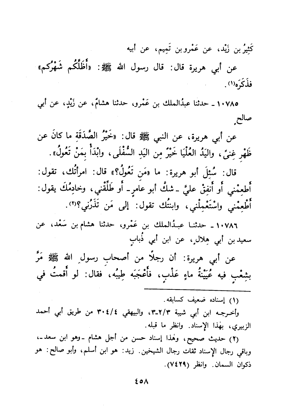 ١٠٧٨٥ - حَدَّثَنَا عَبْدُ الْمَلِكِ بْنُ عَمْرٍو، حَدَّثَنَا هِشَامٌ، عَنْ زَيْدٍ، عَنْ أَبِي صَالِحٍ، عَنْ أَبِي هُرَيْرَةَ، عَنِ النَّبِيِّ صَلَّى اللهُ عَلَيْهِ وَسَلَّمَ قَالَ: " خَيْرُ الصَّدَقَةِ مَا كَانَ عَنْ ظَهْرِ غِنًى، وَالْيَدُ الْعُلْيَا خَيْرٌ مِنَ الْيَدِ السُّفْلَى، وَابْدَأْ بِمَنْ تَعُولُ " قَالَ: سُئِلَ أَبُو هُرَيْرَةَ مَا " مَنْ تَعُولُ؟ " قَالَ: امْرَأَتُكَ، تَقُولُ: أَطْعِمْنِي أَوْ أَنْفِقْ عَلَيَّ - شَكَّ أَبُو عَامِرٍ - أَوْ طَلِّقْنِي، وَخَادِمُكَ يَقُولُ: أَطْعِمْنِي وَاسْتَعْمِلْنِي، وَابْنَتُكَ تَقُولُ: إِلَى مَنْ تَذَرُنِي؟ (٢)
