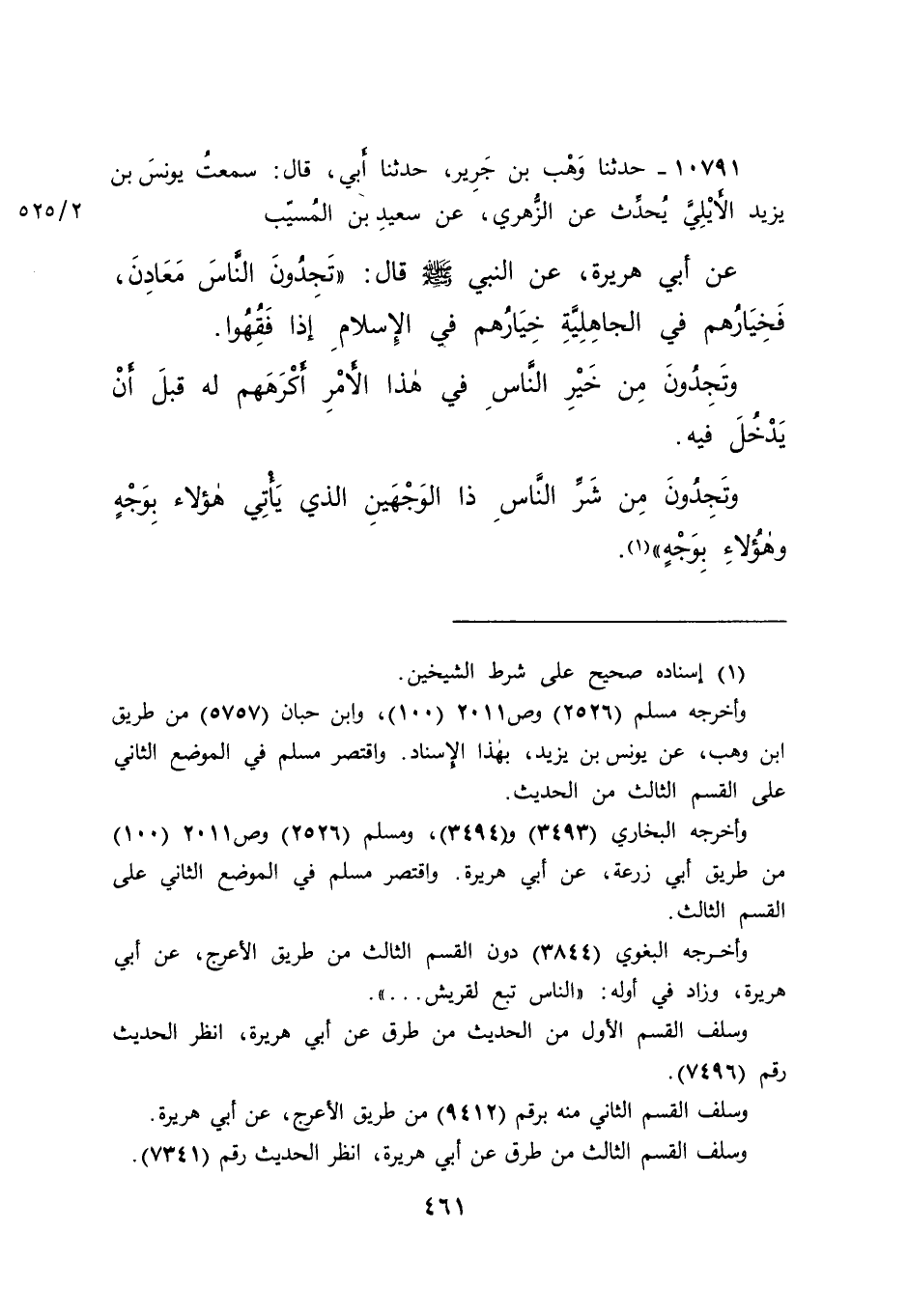 ١٠٧٩١ - حَدَّثَنَا وَهْبُ بْنُ جَرِيرٍ، حَدَّثَنَا أَبِي قَالَ: سَمِعْتُ يُونُسَ بْنَ يَزِيدَ الْأَيْلِيَّ، يُحَدِّثُ عَنِ الزُّهْرِيِّ، عَنْ سَعِيدِ بْنِ الْمُسَيِّبِ، عَنْ أَبِي هُرَيْرَةَ، عَنِ النَّبِيِّ صَلَّى اللهُ عَلَيْهِ وَسَلَّمَ قَالَ: " تَجِدُونَ النَّاسَ مَعَادِنَ، فَخِيَارُهُمْ فِي الْجَاهِلِيَّةِ خِيَارُهُمْ فِي الْإِسْلَامِ إِذَا فَقِهُوا. وَتَجِدُونَ مِنْ خَيْرِ النَّاسِ فِي هَذَا الْأَمْرِ أَكْرَهَهُمْ لَهُ قَبْلَ أَنْ يَدْخُلَ فِيهِ. وَتَجِدُونَ مِنْ شَرِّ النَّاسِ ذَا الْوَجْهَيْنِ الَّذِي يَأْتِي هَؤُلَاءِ بِوَجْهٍ وَهَؤُلَاءِ بِوَجْهٍ " (١)