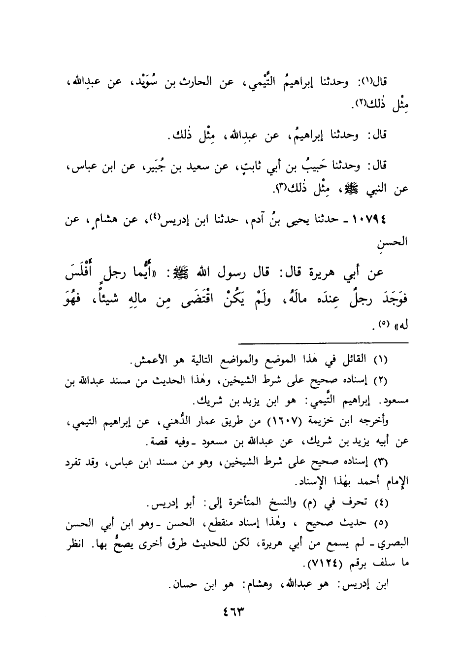 ١٠٧٩٤ - حَدَّثَنَا يَحْيَى بْنُ آدَمَ، حَدَّثَنَا ابْنُ إِدْرِيسَ (٤) ، عَنْ هِشَامٍ، عَنِ الْحَسَنِ، عَنْ أَبِي هُرَيْرَةَ، قَالَ: قَالَ رَسُولُ اللهِ صَلَّى اللهُ عَلَيْهِ وَسَلَّمَ: " أَيُّمَا رَجُلٍ أَفْلَسَ فَوَجَدَ رَجُلٌ عِنْدَهُ مَالَهُ، وَلَمْ يَكُنْ اقْتَضَى مِنْ مَالِهِ شَيْئًا، فَهُوَ لَهُ " (٥)