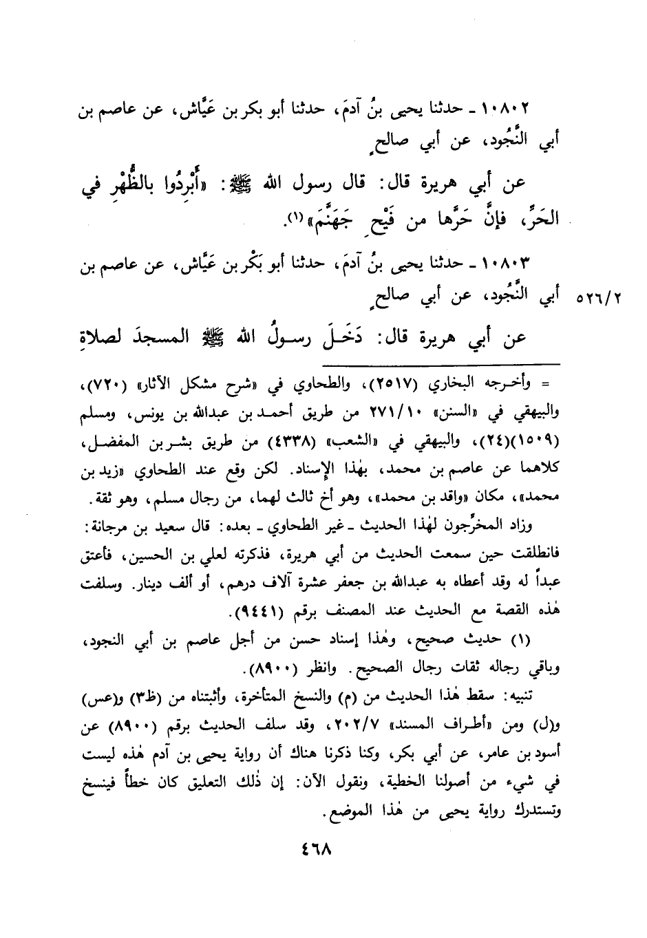 ١٠٨٠٢ - حَدَّثَنَا يَحْيَى بْنُ آدَمَ، حَدَّثَنَا أَبُو بَكْرِ بْنُ عَيَّاشٍ، عَنْ عَاصِمِ بْنِ أَبِي النَّجُودِ، عَنْ أَبِي صَالِحٍ، عَنْ أَبِي هُرَيْرَةَ قَالَ: قَالَ رَسُولُ اللهِ صَلَّى اللهُ عَلَيْهِ وَسَلَّمَ: " أَبْرِدُوا بِالظُّهْرِ فِي الْحَرِّ فَإِنَّ حَرَّهَا مِنْ فَيْحِ جَهَنَّمَ " (١)