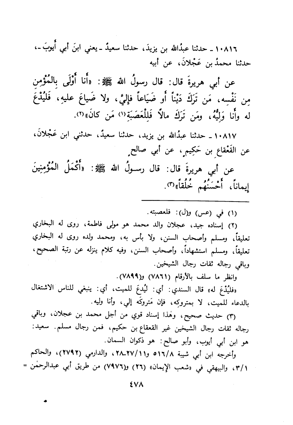 ١٠٨١٧ - حَدَّثَنَا عَبْدُ اللهِ بْنُ يَزِيدَ، حَدَّثَنَا سَعِيدٌ، حَدَّثَنِي ابْنُ عَجْلَانَ، عَنِ الْقَعْقَاعِ بْنِ حَكِيمٍ، عَنْ أَبِي صَالِحٍ، عَنْ أَبِي هُرَيْرَةَ، قَالَ: قَالَ رَسُولُ اللهِ صَلَّى اللهُ عَلَيْهِ وَسَلَّمَ: " أَكْمَلُ الْمُؤْمِنِينَ إِيمَانًا، أَحْسَنُهُمْ خُلُقًا " (٣)