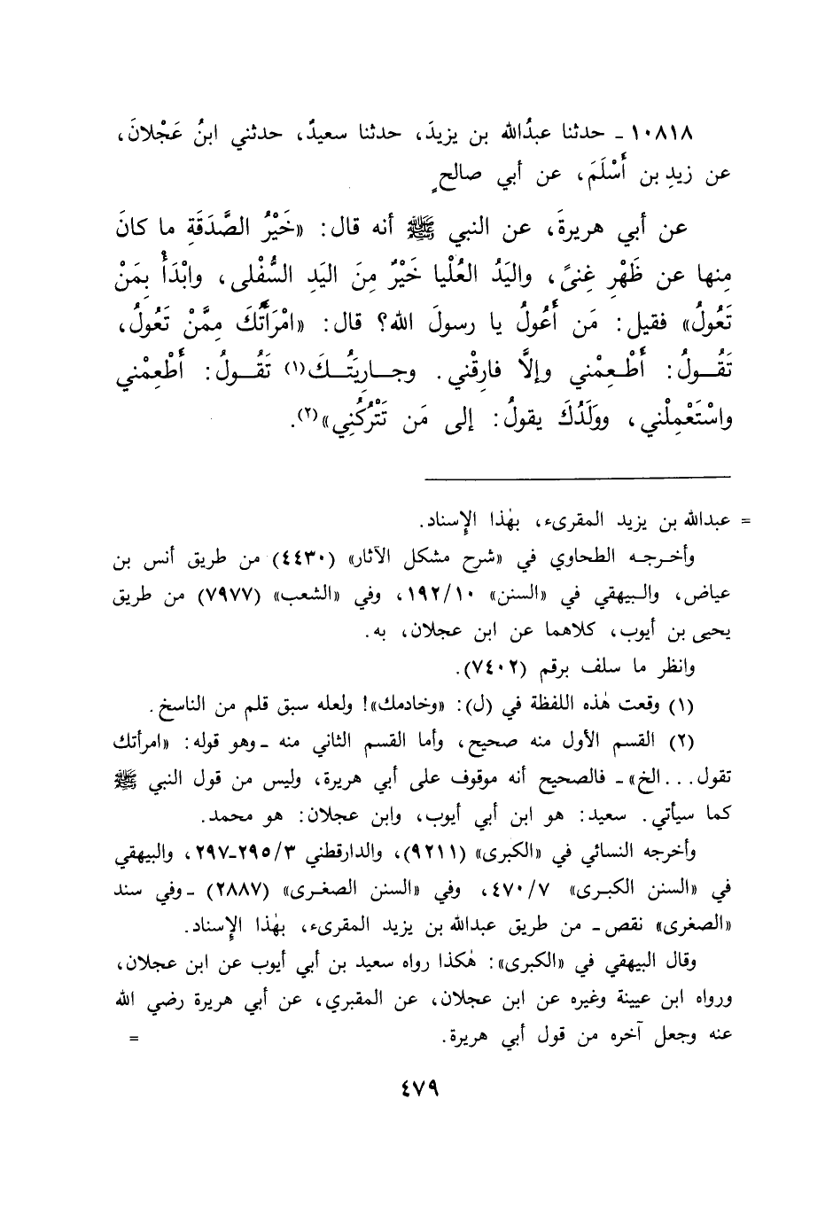 ١٠٨١٨ - حَدَّثَنَا عَبْدُ اللهِ بْنُ يَزِيدَ، حَدَّثَنَا سَعِيدٌ، حَدَّثَنِي ابْنُ عَجْلَانَ، عَنْ زَيْدِ بْنِ أَسْلَمَ، عَنْ أَبِي صَالِحٍ، عَنْ أَبِي هُرَيْرَةَ، عَنِ النَّبِيِّ صَلَّى اللهُ عَلَيْهِ وَسَلَّمَ أَنَّهُ قَالَ: " خَيْرُ الصَّدَقَةِ مَا كَانَ مِنْهَا عَنْ ظَهْرِ غِنًى، وَالْيَدُ الْعُلْيَا خَيْرٌ مِنَ الْيَدِ السُّفْلَى، وَابْدَأْ بِمَنْ تَعُولُ " فَقِيلَ: مَنْ أَعُولُ يَا رَسُولَ اللهِ؟ قَالَ: " امْرَأَتُكَ مِمَّنْ تَعُولُ، تَقُولُ: أَطْعِمْنِي وَإِلَّا فَارِقْنِي. وَجَارِيَتُكَ (١) تَقُولُ: أَطْعِمْنِي وَاسْتَعْمِلْنِي، وَوَلَدُكَ يَقُولُ: إِلَى مَنْ تَتْرُكُنِي " (٢)