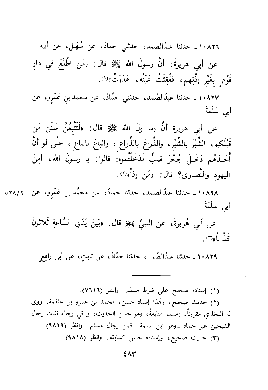 ١٠٨٢٧ - حَدَّثَنَا عَبْدُ الصَّمَدِ، حَدَّثَنِي حَمَّادٌ، عَنْ مُحَمَّدِ بْنِ عَمْرٍو، عَنْ أَبِي سَلَمَةَ، عَنْ أَبِي هُرَيْرَةَ، أَنَّ رَسُولَ اللهِ صَلَّى اللهُ عَلَيْهِ وَسَلَّمَ قَالَ: " لَتَتَّبِعُنَّ سَنَنَ مَنْ قَبْلَكُمْ، الشِّبْرَ بِالشِّبْرِ، وَالذِّرَاعَ بِالذِّرَاعِ، وَالْبَاعَ بِالْبَاعِ، حَتَّى لَوْ أَنَّ أَحَدَهُمْ دَخَلَ جُحْرَ ضَبٍّ لَدَخَلْتُمُوهُ " قَالُوا: يَا رَسُولَ اللهِ، أَمِنَ الْيَهُودِ وَالنَّصَارَى؟ قَالَ: " مَنْ إِذًا " (٢)