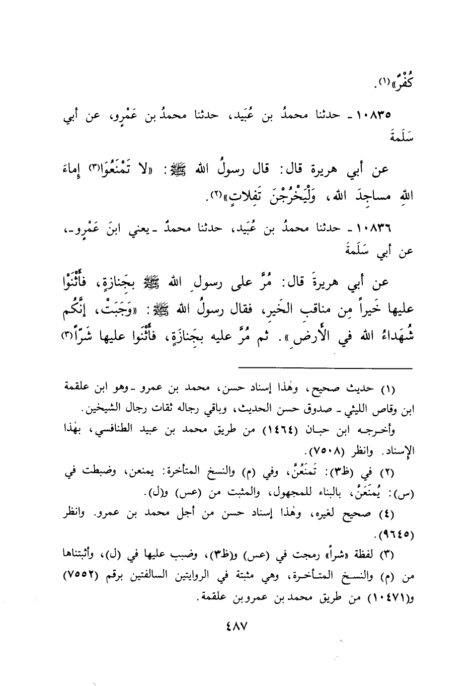 ١٠٨٣٦ - حَدَّثَنَا مُحَمَّدُ بْنُ عُبَيْدٍ، حَدَّثَنَا مُحَمَّدٌ يَعْنِي ابْنَ عَمْرٍو، عَنْ أَبِي سَلَمَةَ، عَنْ أَبِي هُرَيْرَةَ، قَالَ: مُرَّ عَلَى رَسُولِ اللهِ صَلَّى اللهُ عَلَيْهِ وَسَلَّمَ بِجِنَازَةٍ، فَأَثْنَوْا عَلَيْهَا خَيْرًا مِنْ مَنَاقِبِ الْخَيْرِ، فَقَالَ رَسُولُ اللهِ صَلَّى اللهُ عَلَيْهِ وَسَلَّمَ: " وَجَبَتْ، إِنَّكُمْ شُهَدَاءُ اللهِ فِي الْأَرْضِ ". ثُمَّ مَرَّ عَلَيْهِ بِجِنَازَةٍ، فَأَثْنَوْا عَلَيْهَا شَرًّا (٤)