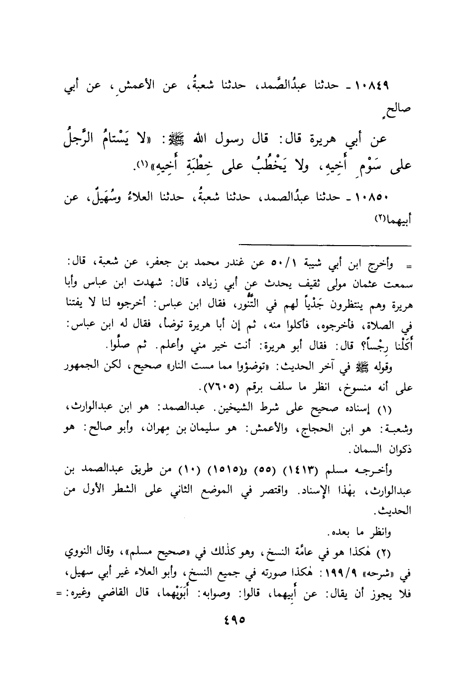 ١٠٨٤٩ - حَدَّثَنَا عَبْدُ الصَّمَدِ، حَدَّثَنَا شُعْبَةُ، عَنِ الْأَعْمَشِ، عَنْ أَبِي صَالِحٍ، عَنْ أَبِي هُرَيْرَةَ، قَالَ: قَالَ رَسُولُ اللهِ صَلَّى اللهُ عَلَيْهِ وَسَلَّمَ: " لَا يَسْتَامُ الرَّجُلُ عَلَى سَوْمِ أَخِيهِ، وَلَا يَخْطُبْ عَلَى خِطْبَةِ أَخِيهِ " (١)