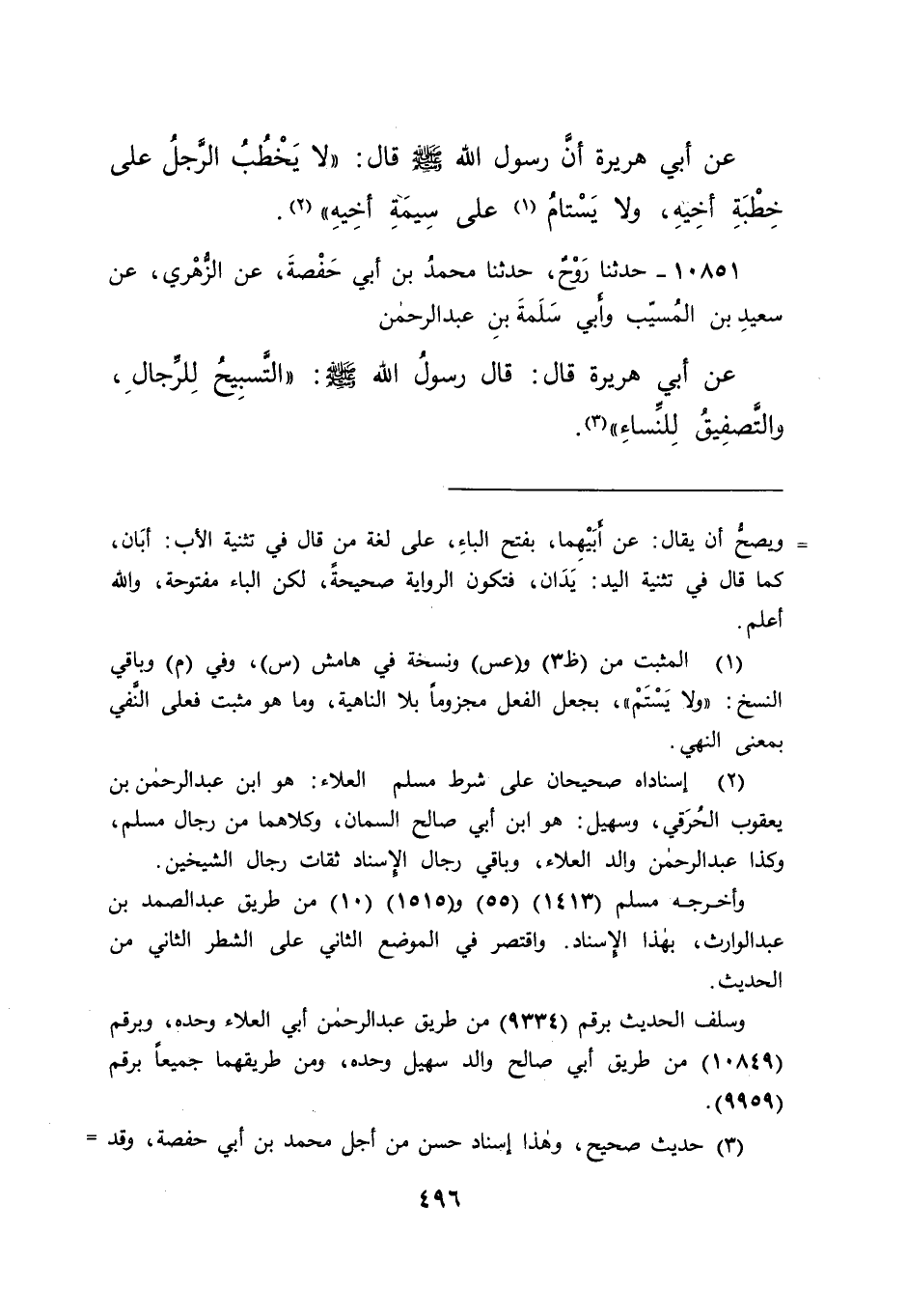 ١٠٨٥١ - حَدَّثَنَا رَوْحٌ، حَدَّثَنَا مُحَمَّدُ بْنُ أَبِي حَفْصَةَ، عَنِ الزُّهْرِيِّ، عَنْ سَعِيدِ بْنِ الْمُسَيِّبِ، وَأَبِي سَلَمَةَ بْنِ عَبْدِ الرَّحْمَنِ، عَنْ أَبِي هُرَيْرَةَ، قَالَ: قَالَ رَسُولُ اللهِ صَلَّى اللهُ عَلَيْهِ وَسَلَّمَ: " التَّسْبِيحُ لِلرِّجَالِ، وَالتَّصْفِيقُ لِلنِّسَاءِ " (٣)