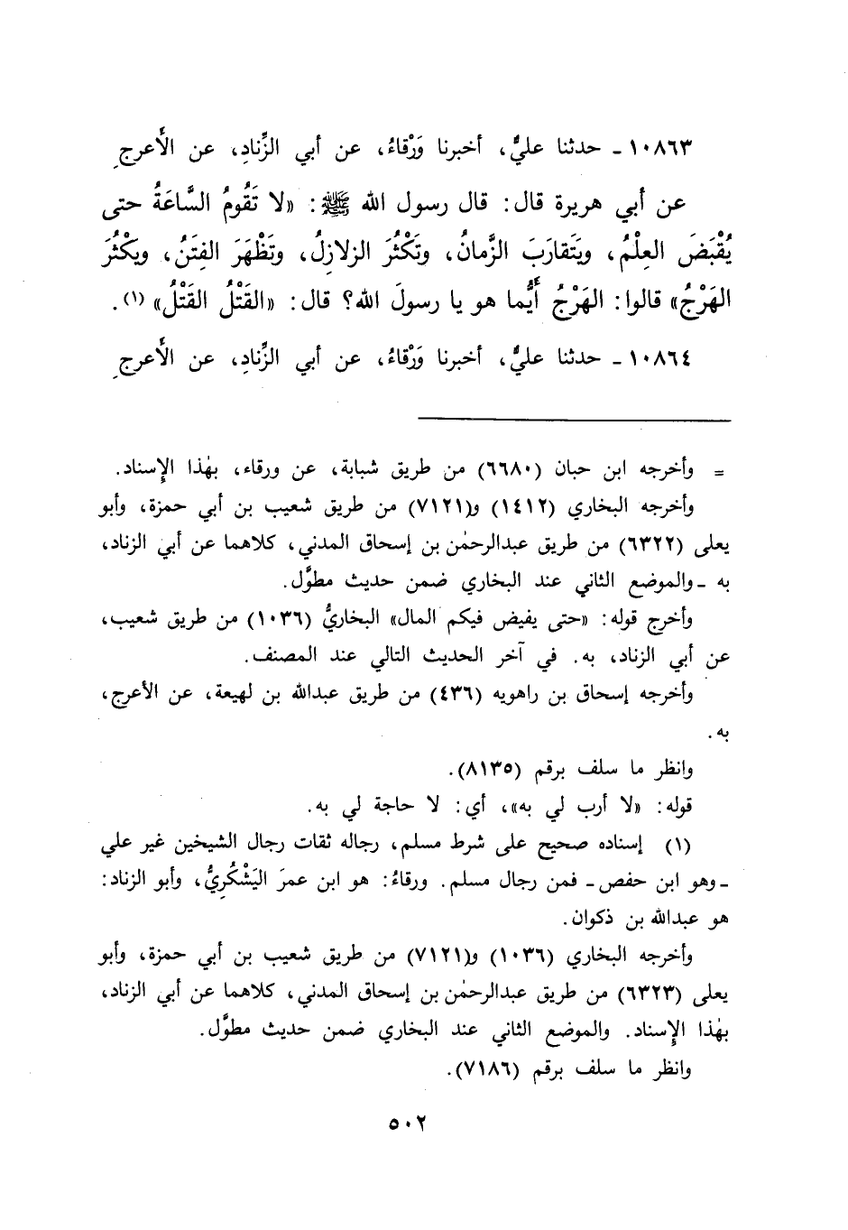 ١٠٨٦٣ - حَدَّثَنَا عَلِيٌّ، أَخْبَرَنَا وَرْقَاءُ، عَنْ أَبِي الزِّنَادِ، عَنِ الْأَعْرَجِ، عَنْ أَبِي هُرَيْرَةَ، قَالَ: قَالَ رَسُولُ اللهِ صَلَّى اللهُ عَلَيْهِ وَسَلَّمَ: " لَا تَقُومُ السَّاعَةُ حَتَّى يُقْبَضَ الْعِلْمُ، وَيَتَقَارَبَ الزَّمَانُ، وَتَكْثُرَ الزَّلَازِلُ، وَتَظْهَرَ الْفِتَنُ، وَيَكْثُرَ الْهَرْجُ " قَالُوا: الْهَرْجُ أَيُّمَا هُوَ يَا رَسُولَ اللهِ؟ قَالَ: " الْقَتْلُ الْقَتْلُ " (١)