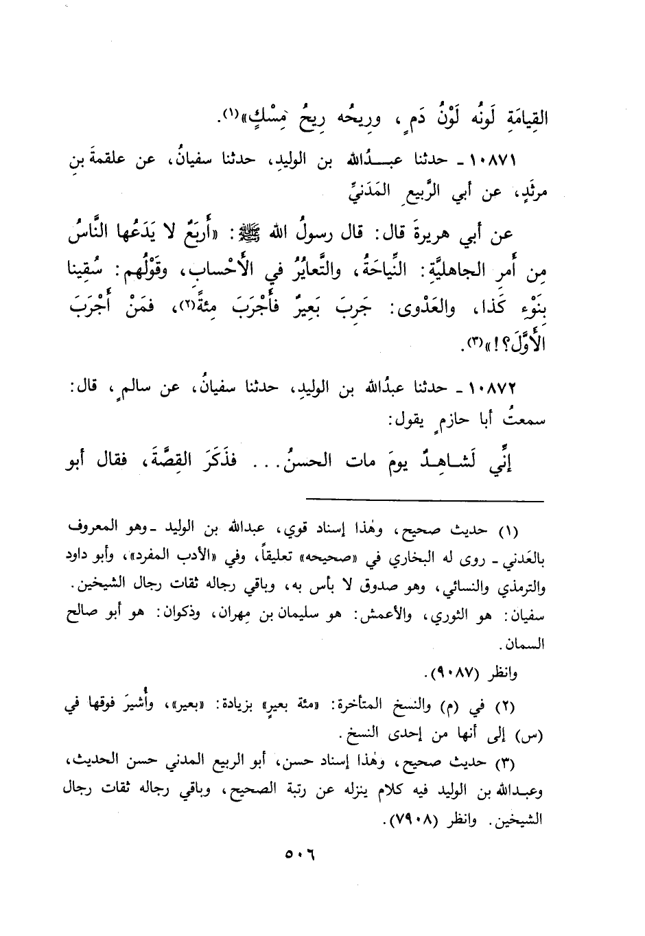 ١٠٨٧١ - حَدَّثَنَا عَبْدُ اللهِ بْنُ الْوَلِيدِ، حَدَّثَنَا سُفْيَانُ، عَنْ عَلْقَمَةَ بْنِ مَرْثَدٍ، عَنْ أَبِي الرَّبِيعِ الْمَدَنِيِّ، عَنْ أَبِي هُرَيْرَةَ، قَالَ: قَالَ رَسُولُ اللهِ صَلَّى اللهُ عَلَيْهِ وَسَلَّمَ: " أَرْبَعٌ لَا يَدَعُهَا النَّاسُ مِنْ أَمْرِ الْجَاهِلِيَّةِ: النِّيَاحَةُ، وَالتَّعَايُرُ فِي الْأَحْسَابِ، وَقَوْلُهُمْ: سُقِينَا بِنَوْءِ كَذَا، وَالْعَدْوَى: جَرِبَ بَعِيرٌ فَأَجْرَبَ مِئَةً (٢) فَمَنْ أَجْرَبَ الْأَوَّلَ؟ " (٣)