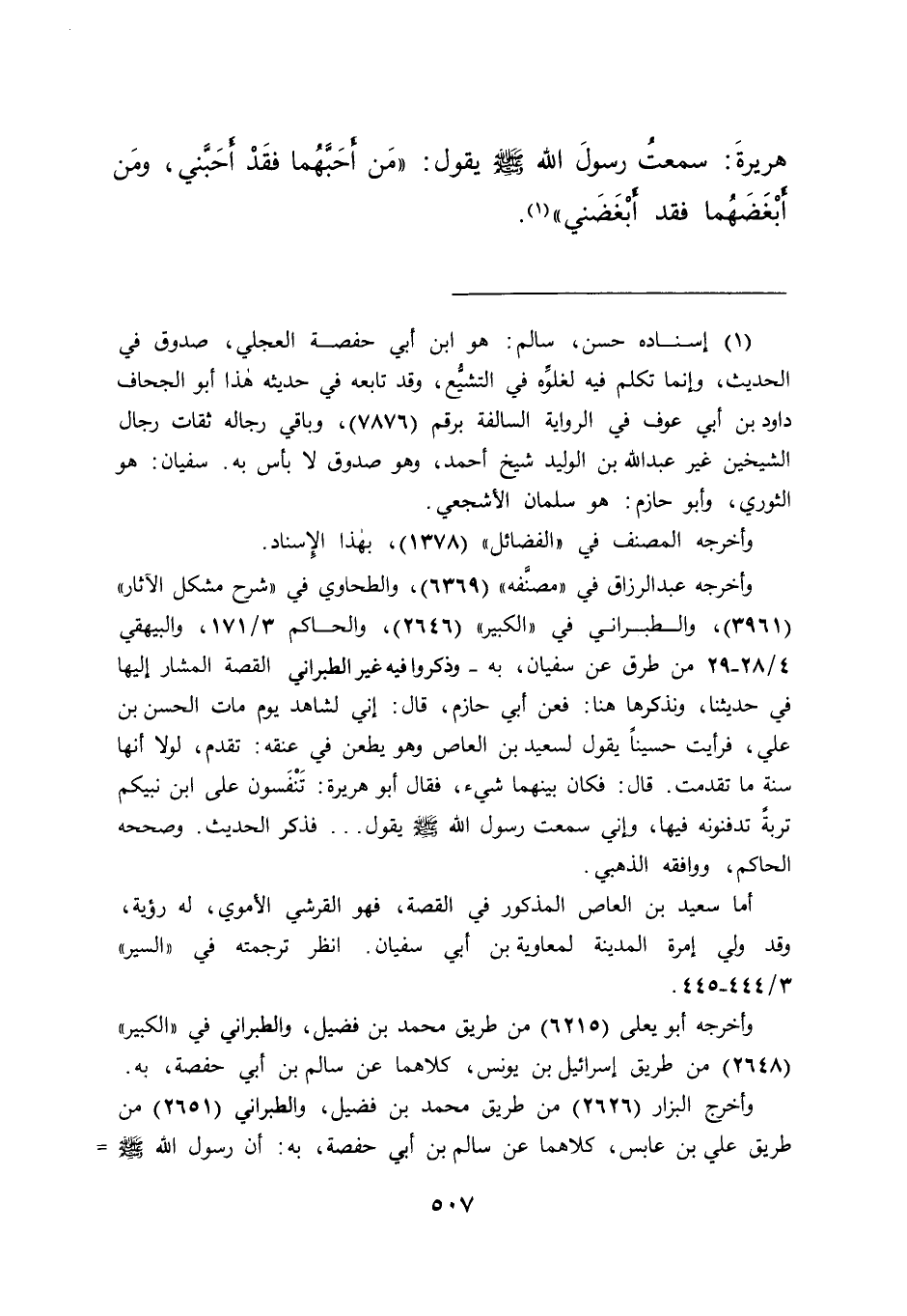 هُرَيْرَةَ سَمِعْتُ رَسُولَ اللهِ صَلَّى اللهُ عَلَيْهِ وَسَلَّمَ يَقُولُ: " مَنْ أَحَبَّهُمَا فَقَدْ أَحَبَّنِي، وَمَنْ أَبْغَضَهُمَا فَقَدْ أَبْغَضَنِي " (١)