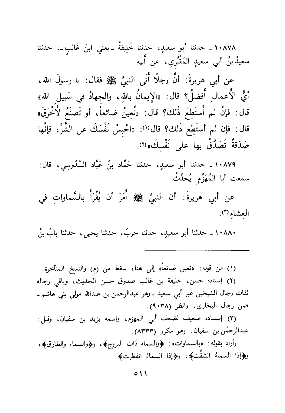 ١٠٨٧٨ - حَدَّثَنَا أَبُو سَعِيدٍ، حَدَّثَنَا خَلِيفَةُ يَعْنِي ابْنَ غَالِبٍ، حَدَّثَنَا سَعِيدُ بْنُ أَبِي سَعِيدٍ الْمَقْبُرِيُّ، عَنْ أَبِيهِ، عَنْ أَبِي هُرَيْرَةَ، أَنَّ رَجُلًا، أَتَى النَّبِيَّ صَلَّى اللهُ عَلَيْهِ وَسَلَّمَ فَقَالَ: يَا رَسُولَ اللهِ، أَيُّ الْأَعْمَالِ أَفْضَلُ؟ قَالَ: " الْإِيمَانُ بِاللهِ، وَالْجِهَادُ فِي سَبِيلِ اللهِ " قَالَ: فَإِنْ لَمْ أَسْتَطِعْ ذَلِكَ؟ قَالَ: " تُعِينُ ضَائِعًا أَوْ تَصْنَعُ لِأَخْرَقَ " قَالَ: فَإِنْ لَمْ أَسْتَطِعْ ذَلِكَ؟ قَالَ (١) : " احْبِسْ نَفْسَكَ عَنِ الشَّرِّ، فَإِنَّهَا صَدَقَةٌ تَصَدَّقُ بِهَا عَلَى نَفْسِكَ " (٢)