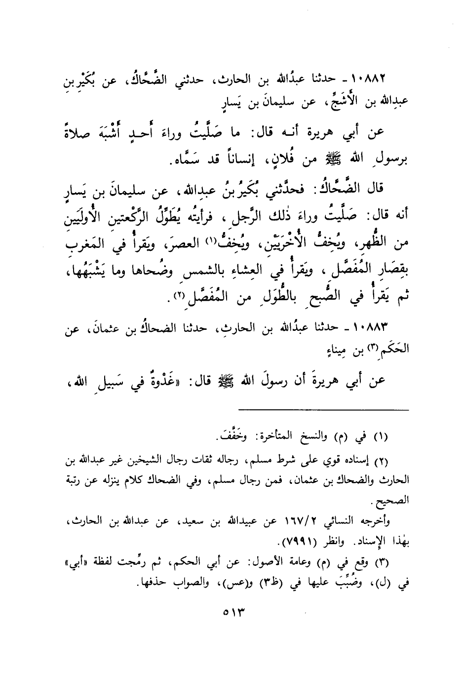 ١٠٨٨٢ - حَدَّثَنَا عَبْدُ اللهِ بْنُ الْحَارِثِ، حَدَّثَنِي الضَّحَّاكُ، عَنْ بُكَيْرِ بْنِ عَبْدِ اللهِ بْنِ الْأَشَجِّ، عَنْ سُلَيْمَانَ بْنِ يَسَارٍ، عَنْ أَبِي هُرَيْرَةَ، أَنَّهُ قَالَ: مَا صَلَّيْتُ وَرَاءَ أَحَدٍ أَشْبَهَ صَلَاةً بِرَسُولِ اللهِ صَلَّى اللهُ عَلَيْهِ وَسَلَّمَ مِنْ فُلَانٍ، إِنْسَانًا قَدْ سَمَّاهُ. قَالَ الضَّحَّاكُ، فَحَدَّثَنِي بُكَيْرُ بْنُ عَبْدِ اللهِ، عَنْ سُلَيْمَانَ بْنِ يَسَارٍ، أَنَّهُ قَالَ: صَلَّيْتُ وَرَاءَ ذَلِكَ الرَّجُلِ فَرَأَيْتُهُ " يُطَوِّلُ الرَّكْعَتَيْنِ الْأُولَيَيْنِ مِنَ الظُّهْرِ، وَيُخِفُّ الْآخِرَيْنِ، وَيُخِفَّ (١) الْعَصْرَ، وَيَقْرَأُ فِي الْمَغْرِبِ بِقِصَارِ الْمُفَصَّلِ، وَيَقْرَأُ فِي الْعِشَاءِ بِالشَّمْسِ وَضُحَاهَا وَمَا يُشْبِهُهَا، ثُمَّ يَقْرَأُ فِي الصُّبْحِ بِالطُّوَالِ مِنَ الْمُفَصَّلِ " (٢)