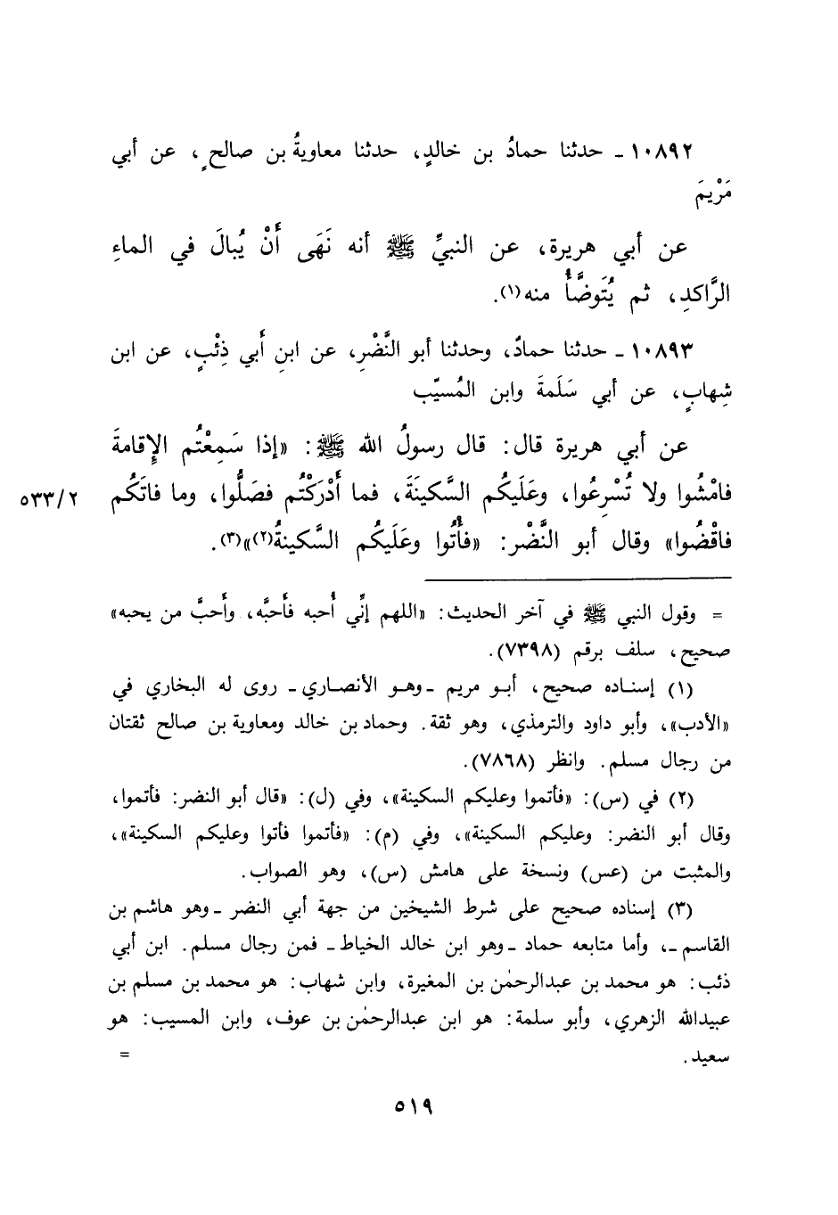 ١٠٨٩٣ - حَدَّثَنَا حَمَّادٌ، وَحَدَّثَنَا أَبُو النَّضْرِ، عَنِ ابْنِ أَبِي ذِئْبٍ، عَنِ ابْنِ شِهَابٍ، عَنْ أَبِي سَلَمَةَ، وَابْنِ الْمُسَيِّبِ، عَنْ أَبِي هُرَيْرَةَ، قَالَ: قَالَ رَسُولُ اللهِ صَلَّى اللهُ عَلَيْهِ وَسَلَّمَ: " إِذَا سَمِعْتُمُ الْإِقَامَةَ فَامْشُوا، وَلَا تُسْرِعُوا، وَعَلَيْكُمُ السَّكِينَةَ، فَمَا أَدْرَكْتُمْ فَصَلُّوا وَمَا فَاتَكُمْ فَاقْضُوا - وَقَالَ أَبُو النَّضْرِ: فَأْتُوا وَعَلَيْكُمُ السَّكِينَةَ (٢) " (٣)