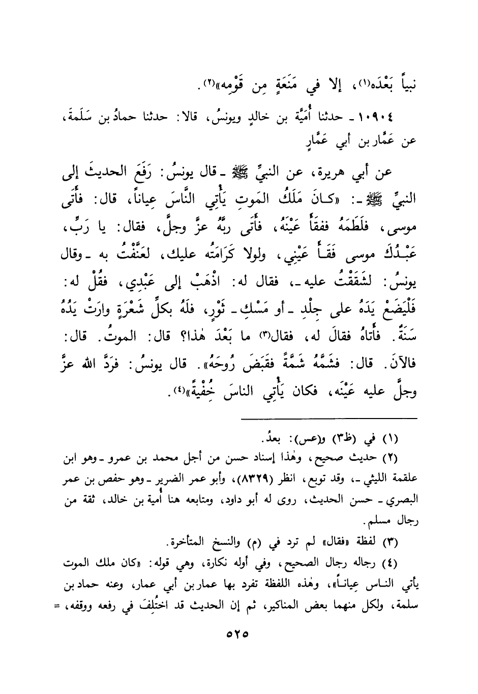 ١٠٩٠٤ - حَدَّثَنَا أُمَيَّةُ بْنُ خَالِدٍ، وَيُونُسُ، قَالَا: حَدَّثَنَا حَمَّادُ بْنُ سَلَمَةَ، عَنْ عَمَّارِ بْنِ أَبِي عَمَّارٍ، عَنْ أَبِي هُرَيْرَةَ، عَنِ النَّبِيِّ صَلَّى اللهُ عَلَيْهِ وَسَلَّمَ - قَالَ يُونُسُ: رَفَعَ الْحَدِيثَ إِلَى النَّبِيِّ صَلَّى اللهُ عَلَيْهِ وَسَلَّمَ - " كَانَ مَلَكُ الْمَوْتِ يَأْتِي النَّاسَ عِيَانًا، قَالَ: فَأَتَى مُوسَى فَلَطَمَهُ فَفَقَأَ عَيْنَهُ، فَأَتَى رَبَّهُ عَزَّ وَجَلَّ فَقَالَ: يَا رَبِّ عَبْدُكَ مُوسَى، فَقَأَ عَيْنِي، وَلَوْلَا كَرَامَتُهُ عَلَيْكَ لَعَنُفْتُ بِهِ - وَقَالَ يُونُسُ: لَشَقَقْتُ عَلَيْهِ - فَقَالَ لَهُ: اذْهَبْ إِلَى عَبْدِي فَقُلْ لَهُ فَلْيَضَعْ يَدَهُ عَلَى جِلْدِ - أَوْ مَسْكِ ثَوْرٍ، فَلَهُ بِكُلِّ شَعَرَةٍ وَارَتْ يَدُهُ سَنَةٌ، فَأَتَاهُ فَقَالَ لَهُ: فَقَالَ (٣) مَا بَعْدَ هَذَا؟ قَالَ: الْمَوْتُ، قَالَ: فَالْآنَ، قَالَ: فَشَمَّهُ شَمَّةً فَقَبَضَ رُوحَهُ، قَالَ يُونُسُ: فَرَدَّ اللهُ عَزَّ وَجَلَّ عَلَيْهِ عَيْنَهُ فَكَانَ يَأْتِي النَّاسَ خُفْيَةً " (٤)
