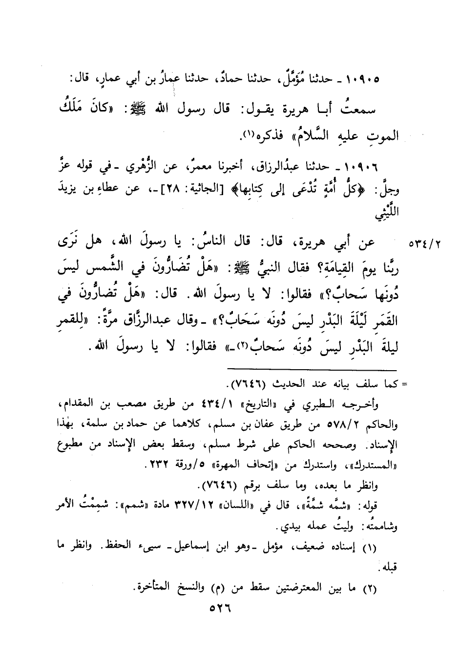 ١٠٩٠٦ - حَدَّثَنَا عَبْدُ الرَّزَّاقِ، أَخْبَرَنَا مَعْمَرٌ، عَنِ الزُّهْرِيِّ، فِي قَوْلِهِ عَزَّ وَجَلَّ: {كُلُّ أُمَّةٍ تُدْعَى إِلَى كِتَابِهَا} [الجاثية: ٢٨] ، عَنْ عَطَاءِ بْنِ يَزِيدَ اللَّيْثِيِّ، عَنْ أَبِي هُرَيْرَةَ، قَالَ: قَالَ النَّاسُ: يَا رَسُولَ اللهِ، هَلْ نَرَى رَبَّنَا يَوْمَ الْقِيَامَةِ؟ فَقَالَ النَّبِيُّ صَلَّى اللهُ عَلَيْهِ وَسَلَّمَ: " هَلْ تُضَارُّونَ فِي الشَّمْسِ لَيْسَ دُونَهَا سَحَابٌ " فَقَالُوا: لَا يَا رَسُولَ اللهِ، قَالَ: " هَلْ تُضَارُّونَ فِي الْقَمَرِ لَيْلَةَ الْبَدْرِ لَيْسَ دُونَهُ سَحَابٌ "، وَقَالَ عَبْدُ الرَّزَّاقِ مَرَّةً: " لِلْقَمَرِ لَيْلَةَ الْبَدْرِ لَيْسَ دُونَهُ سَحَابٌ (٢) ؟ " فَقَالُوا: لَا يَا رَسُولَ اللهِ،