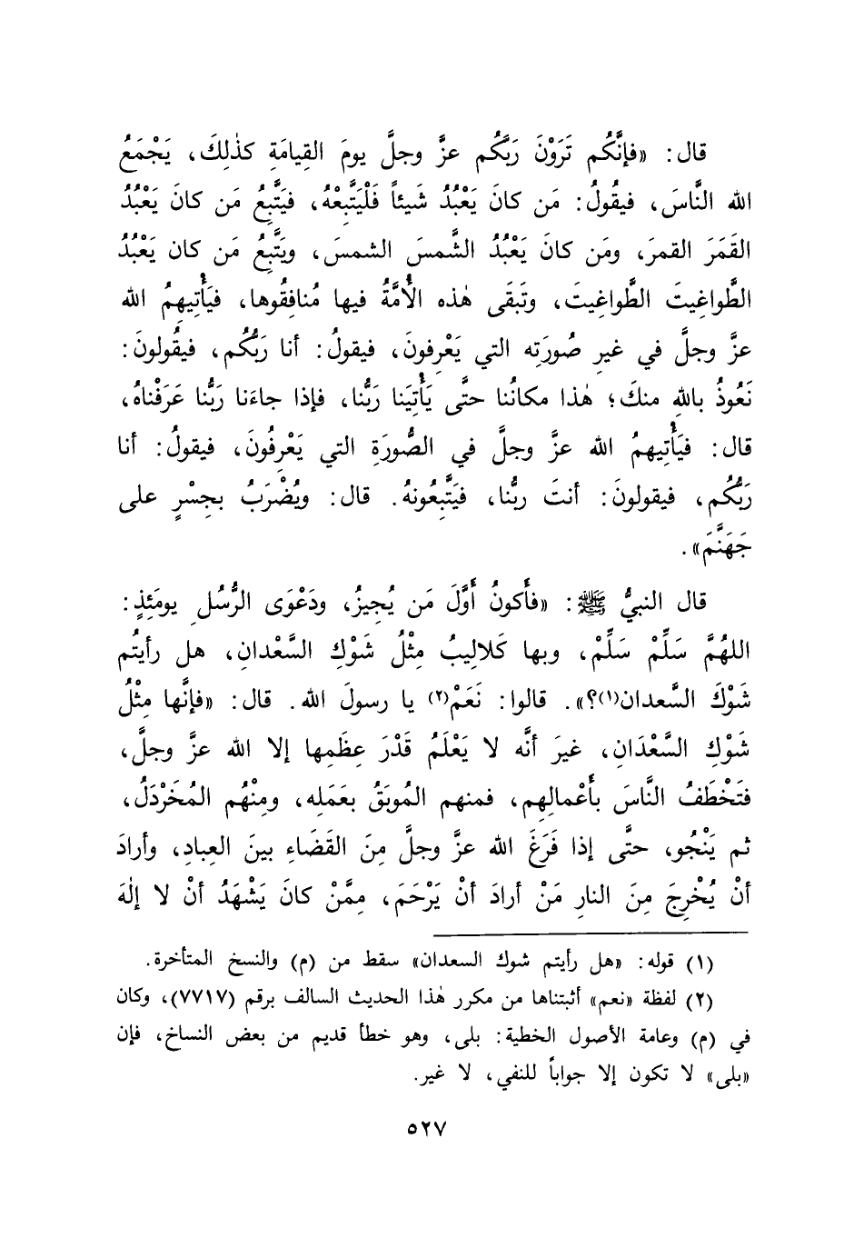 قَالَ: " فَإِنَّكُمْ تَرَوْنَ رَبَّكُمْ عَزَّ وَجَلَّ يَوْمَ الْقِيَامَةِ كَذَلِكَ يَجْمَعُ اللهُ النَّاسَ، فَيَقُولُ: مَنْ كَانَ يَعْبُدُ شَيْئًا فَلْيَتَّبِعْهُ، فَيَتَّبِعُ مَنْ كَانَ يَعْبُدُ الْقَمَرَ الْقَمَرَ، وَمَنْ كَانَ يَعْبُدُ الشَّمْسَ الشَّمْسَ، وَيَتَّبِعُ مَنْ كَانَ يَعْبُدُ الطَّوَاغِيتَ الطَّوَاغِيتَ، وَتَبْقَى هَذِهِ الْأُمَّةُ فِيهَا مُنَافِقُوهَا، فَيَأْتِيهِمُ اللهُ عَزَّ وَجَلَّ فِي غَيْرِ صُورَتِهِ الَّتِي يَعْرِفُونَ فَيَقُولُ: أَنَا رَبُّكُمْ، فَيَقُولُونَ: نَعُوذُ بِاللهِ مِنْكَ، هَذَا مَكَانُنَا حَتَّى يَأْتِيَنَا رَبُّنَا فَإِذَا جَاءَنَا رَبُّنَا عَرَفْنَاهُ، قَالَ: فَيَأْتِيهِمُ اللهُ عَزَّ وَجَلَّ فِي الصُّورَةِ الَّتِي يَعْرِفُونَ، فَيَقُولُ: أَنَا رَبُّكُمْ، فَيَقُولُونَ: أَنْتَ رَبُّنَا فَيَتَّبِعُونَهُ، قَالَ: وَيُضْرَبُ بِجِسْرٍ عَلَى جَهَنَّمَ "، قَالَ النَّبِيُّ صَلَّى اللهُ عَلَيْهِ وَسَلَّمَ: " فَأَكُونُ أَوَّلَ مَنْ يُجِيزُ، وَدَعْوَى الرُّسُلِ يَوْمَئِذٍ: اللهُمَّ سَلِّمْ سَلِّمْ، وَبِهَا كَلَالِيبُ مِثْلُ شَوْكِ السَّعْدَانِ " هَلْ رَأَيْتُمْ شَوْكَ السَّعْدَانِ (١) ؟ " قَالُوا: نَعَمْ (٢) يَا رَسُولَ اللهِ، قَالَ: " فَإِنَّهَا مِثْلُ شَوْكِ السَّعْدَانِ غَيْرَ أَنَّهُ لَا يَعْلَمُ قَدْرَ عِظَمِهَا إِلَّا اللهُ عَزَّ وَجَلَّ، فَتَخْطَفُ النَّاسَ بِأَعْمَالِهِمْ، فَمِنْهُمُ الْمُوبَقُ بِعَمَلِهِ، وَمِنْهُمُ الْمُخَرْدَلُ، ثُمَّ يَنْجُو، حَتَّى إِذَا فَرَغَ اللهُ عَزَّ وَجَلَّ مِنَ الْقَضَاءِ بَيْنَ الْعِبَادِ، وَأَرَادَ أَنْ يُخْرِجَ مِنَ النَّارِ مَنْ أَرَادَ أَنْ يَرْحَمَ مِمَّنْ كَانَ يَشْهَدُ أَنْ لَا إِلَهَ