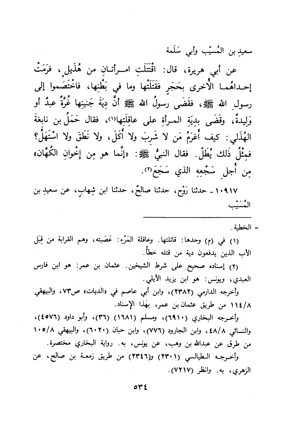 سَعِيدِ بْنِ الْمُسَيِّبِ، وَأَبِي سَلَمَةَ، عَنْ أَبِي هُرَيْرَةَ، قَالَ: اقْتَتَلَتْ امْرَأَتَانِ مِنْ هُذَيْلٍ، فَرَمَتْ إِحْدَاهُمَا الْأُخْرَى بِحَجَرٍ فَقَتَلَتْهَا، وَمَا فِي بَطْنِهَا، فَاخْتَصَمُوا إِلَى رَسُولِ اللهِ صَلَّى اللهُ عَلَيْهِ وَسَلَّمَ، فَقَضَى رَسُولُ اللهِ صَلَّى اللهُ عَلَيْهِ وَسَلَّمَ: " أَنَّ دِيَةَ جَنِينِهَا غُرَّةٌ عَبْدٌ أَوْ وَلِيدَةٌ، وَقَضَى بِدِيَةِ الْمَرْأَةِ عَلَى عَاقِلَتِهَا " (١) فَقَالَ حَمَلُ بْنُ نَابِغَةَ الْهُذَلِيُّ: كَيْفَ أَغْرَمُ مَنْ لَا شَرِبَ، وَلَا أَكَلَ، وَلَا نَطَقَ، وَلَا اسْتَهَلَّ؟ فَمِثْلُ ذَلِكَ يُطَلُّ، فَقَالَ النَّبِيُّ صَلَّى اللهُ عَلَيْهِ وَسَلَّمَ: " إِنَّمَا هُوَ مِنْ إِخْوَانِ الْكُهَّانِ مِنْ أَجْلِ سَجْعِهِ الَّذِي سَجَعَ " (٢)