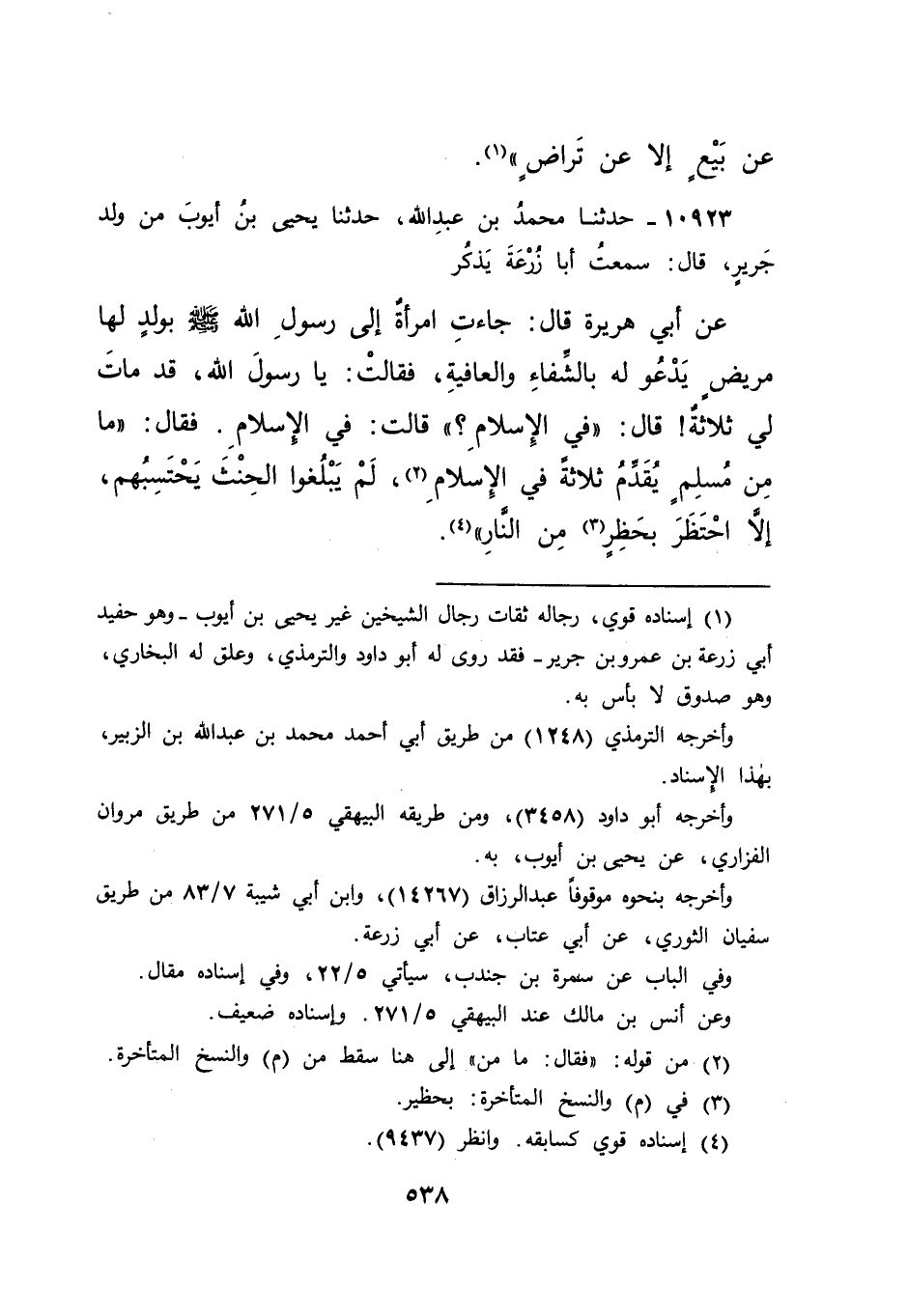 ١٠٩٢٣ - حَدَّثَنَا مُحَمَّدُ بْنُ عَبْدِ اللهِ، حَدَّثَنَا يَحْيَى بْنُ أَيُّوبَ، مِنْ وَلَدِ جَرِيرٍ، قَالَ: سَمِعْتُ أَبَا زُرْعَةَ يُذْكَرُ، عَنْ أَبِي هُرَيْرَةَ، قَالَ: جَاءَتْ امْرَأَةٌ إِلَى رَسُولِ اللهِ صَلَّى اللهُ عَلَيْهِ وَسَلَّمَ بِوَلَدٍ لَهَا مَرِيضٍ، يَدْعُو لَهُ بِالشِّفَاءِ وَالْعَافِيَةِ، فَقَالَتْ: يَا رَسُولَ اللهِ، قَدْ مَاتَ لِي ثَلَاثَةٌ. قَالَ: " فِي الْإِسْلَامِ؟ " قَالَتْ: فِي الْإِسْلَامِ، فَقَالَ: " مَا مِنْ مُسْلِمٍ يُقَدِّمُ ثَلَاثَةً فِي الْإِسْلَامِ (٢) لَمْ يَبْلُغُوا الْحِنْثَ يَحْتَسِبُهُمْ، إِلَّا احْتَظَرَ بِحَظَرٍ (٣) مِنَ النَّارِ " (٤)