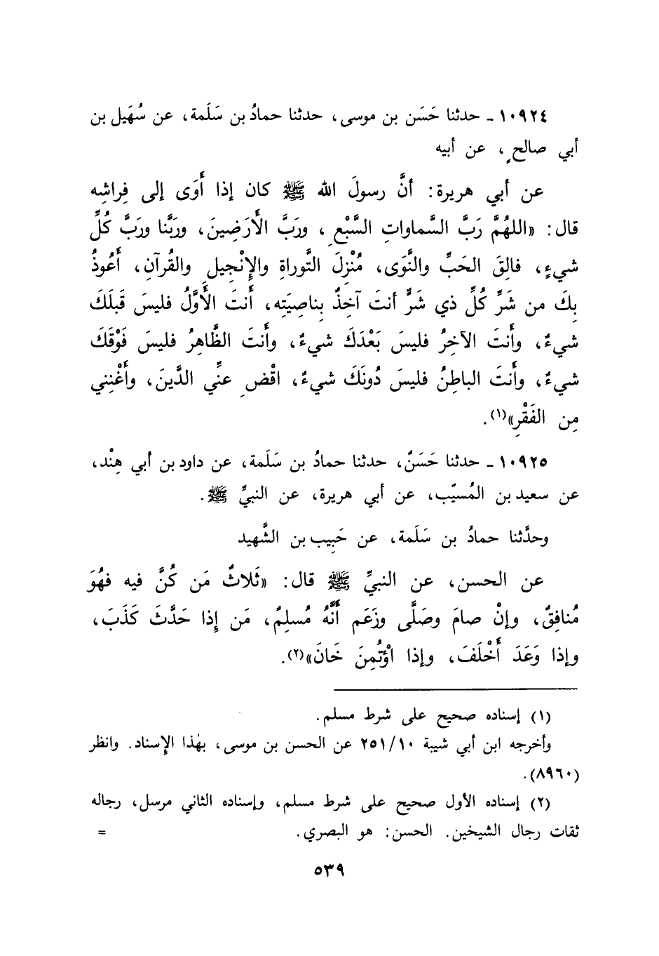 ١٠٩٢٤ - حَدَّثَنَا حَسَنُ بْنُ مُوسَى، حَدَّثَنَا حَمَّادُ بْنُ سَلَمَةَ، عَنْ سُهَيْلِ بْنِ أَبِي صَالِحٍ، عَنْ أَبِيهِ، عَنْ أَبِي هُرَيْرَةَ: أَنَّ رَسُولَ اللهِ صَلَّى اللهُ عَلَيْهِ وَسَلَّمَ كَانَ إِذَا أَوَى إِلَى فِرَاشِهِ قَالَ: " اللهُمَّ رَبَّ السَّمَاوَاتِ السَّبْعِ وَرَبَّ الْأَرَضِينَ، وَرَبَّنَا وَرَبَّ كُلِّ شَيْءٍ، فَالِقَ الْحَبِّ وَالنَّوَى، مُنْزِلَ التَّوْرَاةِ وَالْإِنْجِيلِ وَالْقُرْآنِ، أَعُوذُ بِكَ مِنْ شَرِّ كُلِّ ذِي شَرٍّ أَنْتَ آخِذٌ بِنَاصِيَتِهِ، أَنْتَ الْأَوَّلُ فَلَيْسَ قَبْلَكَ شَيْءٌ، وَأَنْتَ الْآخِرُ فَلَيْسَ بَعْدَكَ شَيْءٌ، وَأَنْتَ الظَّاهِرُ فَلَيْسَ فَوْقَكَ شَيْءٌ، وَأَنْتَ الْبَاطِنُ فَلَيْسَ دُونَكَ شَيْءٌ، اقْضِ عَنِّي الدَّيْنَ وَأَغْنِنِي مِنَ الْفَقْرِ " (١)
