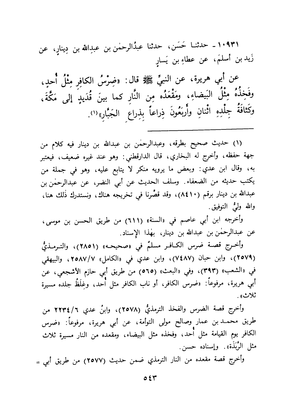 ١٠٩٣١ - حَدَّثَنَا حَسَنٌ، حَدَّثَنَا عَبْدُ الرَّحْمَنِ بْنُ عَبْدِ اللهِ بْنِ دِينَارٍ، عَنْ زَيْدِ بْنِ أَسْلَمَ، عَنْ عَطَاءِ بْنِ يَسَارٍ، عَنْ أَبِي هُرَيْرَةَ، عَنِ النَّبِيِّ صَلَّى اللهُ عَلَيْهِ وَسَلَّمَ قَالَ: " ضِرْسُ الْكَافِرِ مِثْلُ أُحُدٍ، وَفَخِذُهُ مِثْلُ الْبَيْضَاءِ، وَمَقْعَدُهُ مِنَ النَّارِ، كَمَا بَيْنَ قُدَيْدٍ إِلَى مَكَّةَ، وَكَثَافَةُ جِلْدِهِ اثْنَانِ وَأَرْبَعُونَ ذِرَاعًا بِذِرَاعِ الْجَبَّارِ " (١)