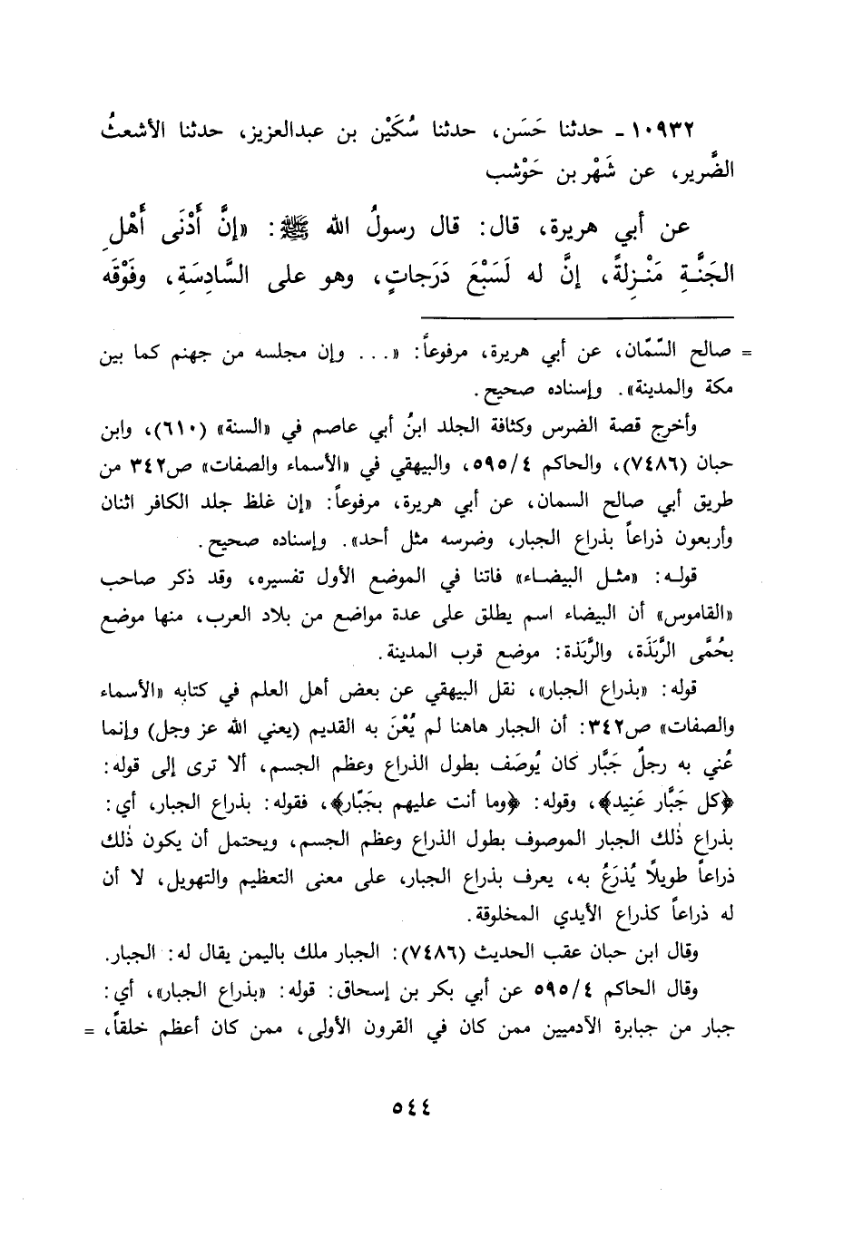 ١٠٩٣٢ - حَدَّثَنَا حَسَنٌ، حَدَّثَنَا سُكَيْنُ بْنُ عَبْدِ الْعَزِيزِ، حَدَّثَنَا الْأَشْعَثُ الضَّرِيرُ، عَنْ شَهْرِ بْنِ حَوْشَبٍ، عَنْ أَبِي هُرَيْرَةَ قَالَ: قَالَ رَسُولُ اللهِ صَلَّى اللهُ عَلَيْهِ وَسَلَّمَ: " إِنَّ أَدْنَى أَهْلِ الْجَنَّةِ مَنْزِلَةً إِنَّ لَهُ لَسَبْعَ دَرَجَاتٍ، وَهُوَ عَلَى السَّادِسَةِ، وَفَوْقَهُ