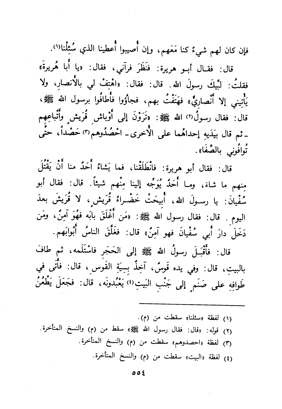 فَإِنْ كَانَ لَهُمْ شَيْءٌ كُنَّا مَعَهُمْ، وَإِنْ أُصِيبُوا أَعْطَيْنَا الَّذِي سُئِلْنَا (١) ، قَالَ: فَقَالَ أَبُو هُرَيْرَةَ: فَنَظَرَ فَرَآنِي، فَقَالَ: " يَا أَبَا هُرَيْرَةَ " فَقُلْتُ: لَبَّيْكَ رَسُولَ اللهِ، قَالَ: فَقَالَ: " اهْتِفْ لِي بِالْأَنْصَارِ، وَلَا يَأْتِينِي إِلَّا أَنْصَارِيٌّ "، فَهَتَفْتُ بِهِمْ فَجَاءُوا، فَأَطَافُوا بِرَسُولِ اللهِ صَلَّى اللهُ عَلَيْهِ وَسَلَّمَ، قَالَ: فَقَالَ رَسُولُ (٢) اللهِ صَلَّى اللهُ عَلَيْهِ وَسَلَّمَ: " تَرَوْنَ إِلَى أَوْبَاشِ قُرَيْشٍ وَأَتْبَاعِهِمْ "، ثُمَّ قَالَ بِيَدَيْهِ: إِحْدَاهُمَا عَلَى الْأُخْرَى احْصُدُوهُمْ (٣) حَصْدًا حَتَّى تُوَافُونِي بِالصَّفَا، قَالَ: فَقَالَ أَبُو هُرَيْرَةَ: فَانْطَلَقْنَا فَمَا يَشَاءُ أَحَدٌ مِنَّا أَنْ يَقْتُلَ مِنْهُمْ مَا شَاءَ، وَمَا أَحَدٌ يُوَجِّهُ إِلَيْنَا مِنْهُمْ شَيْئًا، قَالَ: فَقَالَ أَبُو سُفْيَانَ: يَا رَسُولَ اللهِ، أُبِيحَتْ خَضْرَاءُ قُرَيْشٍ، لَا قُرَيْشَ بَعْدَ الْيَوْمِ، قَالَ: فَقَالَ رَسُولُ اللهِ صَلَّى اللهُ عَلَيْهِ وَسَلَّمَ: " مَنْ أَغْلَقَ بَابَهُ فَهُوَ آمِنٌ، وَمَنْ دَخَلَ دَارَ أَبِي سُفْيَانَ فَهُوَ آمِنٌ " قَالَ: فَغَلَّقَ النَّاسُ أَبْوَابَهُمْ، قَالَ: فَأَقْبَلَ رَسُولُ اللهِ صَلَّى اللهُ عَلَيْهِ وَسَلَّمَ إِلَى الْحَجَرِ فَاسْتَلَمَهُ، ثُمَّ طَافَ بِالْبَيْتِ، قَالَ: وَفِي يَدِهِ قَوْسٌ آخَذٌ بِسِيَةِ الْقَوْسِ، قَالَ: فَأَتَى فِي طَوَافِهِ عَلَى صَنَمٍ إِلَى جَنْبِ الْبَيْتِ (٤) يَعْبُدُونَهُ، قَالَ: فَجَعَلَ يَطْعَنُ