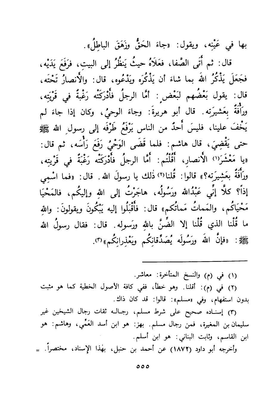 بِهَا فِي عَيْنِهِ، وَيَقُولُ: " جَاءَ الْحَقُّ وَزَهَقَ الْبَاطِلُ "، قَالَ: ثُمَّ أَتَى الصَّفَا فَعَلَاهُ حَيْثُ يُنْظَرُ إِلَى الْبَيْتِ فَرَفَعَ يَدَيْهِ، فَجَعَلَ يَذْكُرُ اللهَ بِمَا شَاءَ أَنْ يَذْكُرَهُ وَيَدْعُوهُ، قَالَ: وَالْأَنْصَارُ تَحْتَهُ، قَالَ: يَقُولُ بَعْضُهُمْ لِبَعْضٍ: أَمَّا الرَّجُلُ فَأَدْرَكَتْهُ رَغْبَةٌ فِي قَرْيَتِهِ، وَرَأْفَةٌ بِعَشِيرَتِهِ، قَالَ أَبُو هُرَيْرَةَ: وَجَاءَ الْوَحْيُ، وَكَانَ إِذَا جَاءَ لَمْ يَخْفَ عَلَيْنَا فَلَيْسَ أَحَدٌ مِنَ النَّاسِ يَرْفَعُ طَرْفَهُ إِلَى رَسُولِ اللهِ صَلَّى اللهُ عَلَيْهِ وَسَلَّمَ حَتَّى يُقْضَى، قَالَ هَاشِمٌ: فَلَمَّا قُضِيَ الْوَحْيُ رَفَعَ رَأْسَهُ، ثُمَّ قَالَ: " يَا مَعْشَرَ (١) الْأَنْصَارِ، أَقُلْتُمْ: أَمَّا الرَّجُلُ فَأَدْرَكَتْهُ رَغْبَةٌ فِي قَرْيَتِهِ، وَرَأْفَةٌ بِعَشِيرَتِهِ؟ " قَالُوا: قُلْنَا (٢) ذَلِكَ يَا رَسُولَ اللهِ، قَالَ: " فَمَا اسْمِي إِذًا؟ كَلَّا إِنِّي عَبْدُ اللهِ وَرَسُولُهُ، هَاجَرْتُ إِلَى اللهِ وَإِلَيْكُمْ، فَالْمَحْيَا مَحْيَاكُمْ وَالْمَمَاتُ مَمَاتُكُمْ " قَالَ: فَأَقْبَلُوا إِلَيْهِ يَبْكُونَ وَيَقُولُونَ: وَاللهِ مَا قُلْنَا الَّذِي قُلْنَا إِلَّا الضِّنَّ بِاللهِ وَرَسُولِهِ، قَالَ: فَقَالَ رَسُولُ اللهِ صَلَّى اللهُ عَلَيْهِ وَسَلَّمَ: " فَإِنَّ اللهَ وَرَسُولَهُ يُصَدِّقَانِكُمْ وَيَعْذُرَانِكُمْ " (٣)