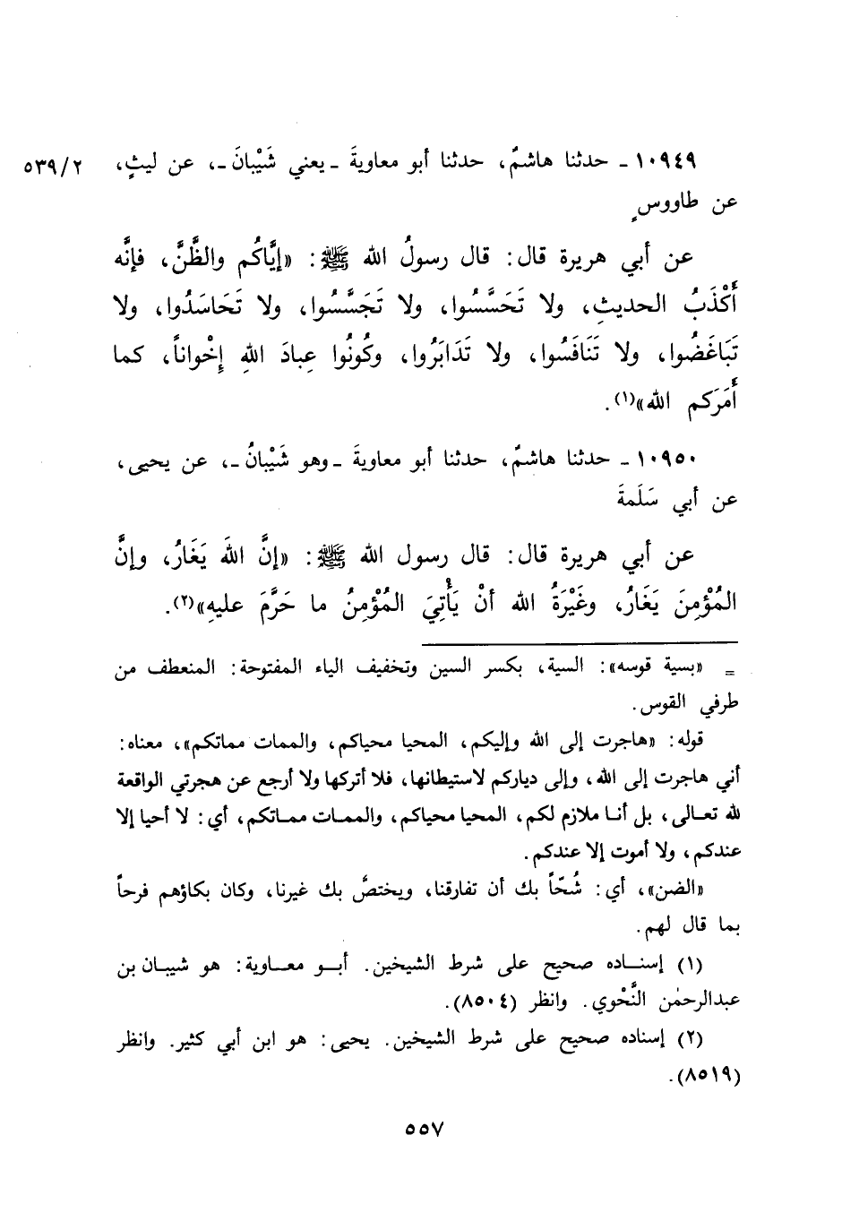 ١٠٩٤٩ - حَدَّثَنَا هَاشِمٌ، حَدَّثَنَا أَبُو مُعَاوِيَةَ يَعْنِي شَيْبَانَ، عَنْ لَيْثٍ، عَنْ طَاوُسٍ، عَنْ أَبِي هُرَيْرَةَ، قَالَ: قَالَ رَسُولُ اللهِ صَلَّى اللهُ عَلَيْهِ وَسَلَّمَ: " إِيَّاكُمْ وَالظَّنَّ، فَإِنَّهُ أَكْذَبُ الْحَدِيثِ، وَلَا تَحَسَّسُوا، وَلَا تَجَسَّسُوا، وَلَا تَحَاسَدُوا، وَلَا تَبَاغَضُوا، وَلَا تَنَافَسُوا، وَلَا تَدَابَرُوا، وَكُونُوا عِبَادَ اللهِ إِخْوَانًا كَمَا أَمَرَكُمُ اللهُ " (١)