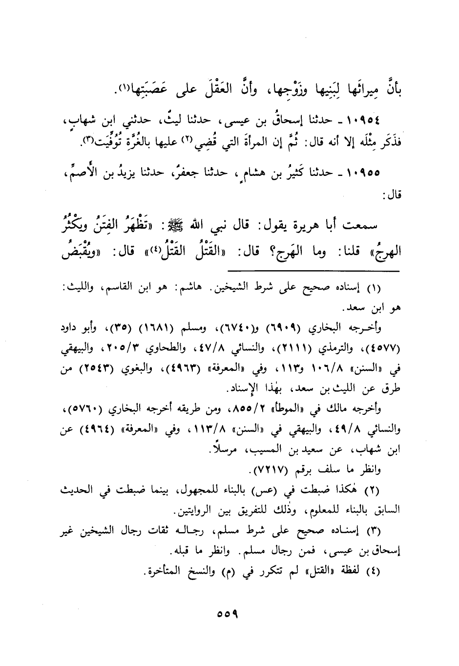 ١٠٩٥٤ - حَدَّثَنَا إِسْحَاقُ بْنُ عِيسَى، حَدَّثَنَا لَيْثٌ، حَدَّثَنِي ابْنُ شِهَابٍ، فَذَكَرَ مِثْلَهُ إِلَّا أَنَّهُ قَالَ: " ثُمَّ إِنَّ الْمَرْأَةَ الَّتِي قَضَى (٢) عَلَيْهَا بِالْغُرَّةِ تُوُفِّيَتْ " (٣)