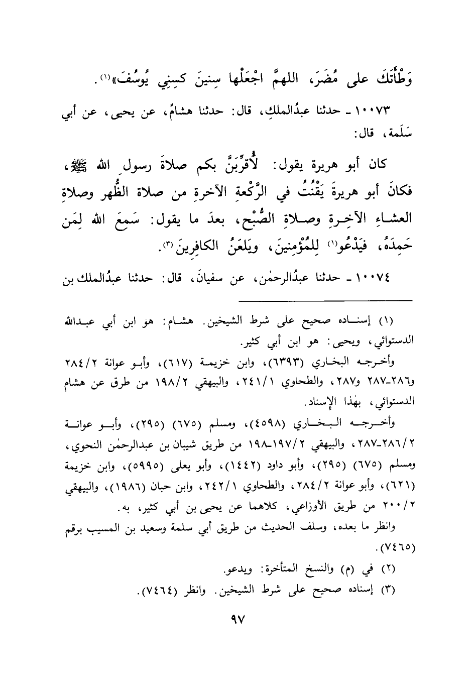 ١٠٠٧٣ - حَدَّثَنَا عَبْدُ الْمَلِكِ، قَالَ: حَدَّثَنَا هِشَامٌ، عَنْ يَحْيَى، عَنِ أَبِي سَلَمَةَ، قَالَ: كَانَ أَبُو هُرَيْرَةَ يَقُولُ: لَأُقَرِّبَنَّ بِكُمْ صَلَاةَ رَسُولِ اللهِ صَلَّى اللهُ عَلَيْهِ وَسَلَّمَ، فَكَانَ أَبُو هُرَيْرَةَ " يَقْنُتُ فِي الرَّكْعَةِ الْآخِرَةِ مِنْ صَلَاةِ الظُّهْرِ، وَصَلَاةِ الْعِشَاءِ الْآخِرَةِ، وَصَلَاةِ الصُّبْحِ بَعْدَمَا يَقُولُ: سَمِعَ اللهُ لِمَنْ حَمِدَهُ، فَيَدْعُو (٢) لِلْمُؤْمِنِينَ، وَيَلْعَنُ الْكَافِرِينَ " (٣)